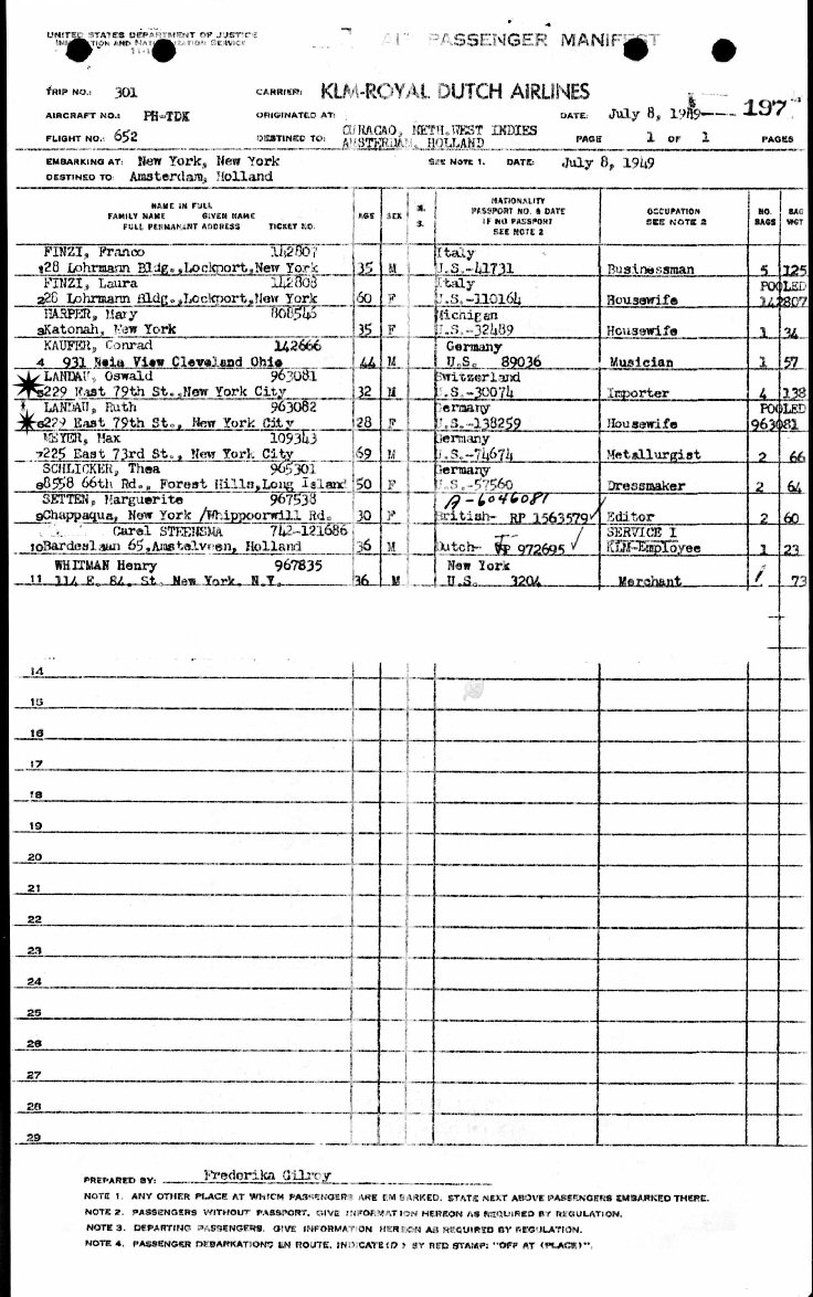 September 22, 1949 - Amsterdam, Netherlands to New York City, New York (KLM Roydal Dutch Airlines) (w/Ruth)