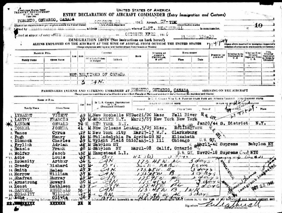 October 22, 1946 - Passenger List - Toronto, Ontario to New York - Canada Trans Airlines