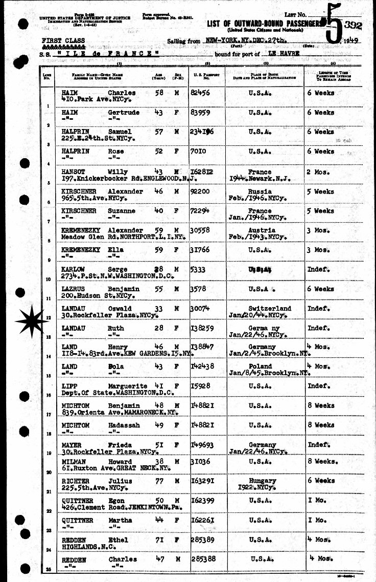 December 27, 1949 - "S.S. Ile de France" New York to Le Havre, France (w/Ruth)
