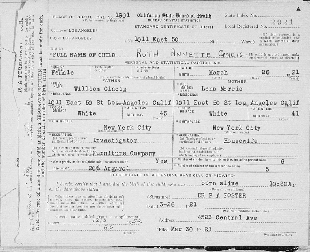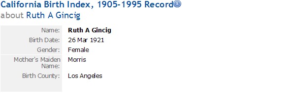 Married: (1) January 1, 1942 Albert Hyman Ropfogel (AKA Albert H Rapp) at Home of Jerome Gincig: 1827 W 8th Street, Los Angeles, Los Angeles County, California 1827 W 8th Street, Los Angeles, Los Angeles County, California . (Marriage License: November 23, 1941, Yuma County, Arizona.)
