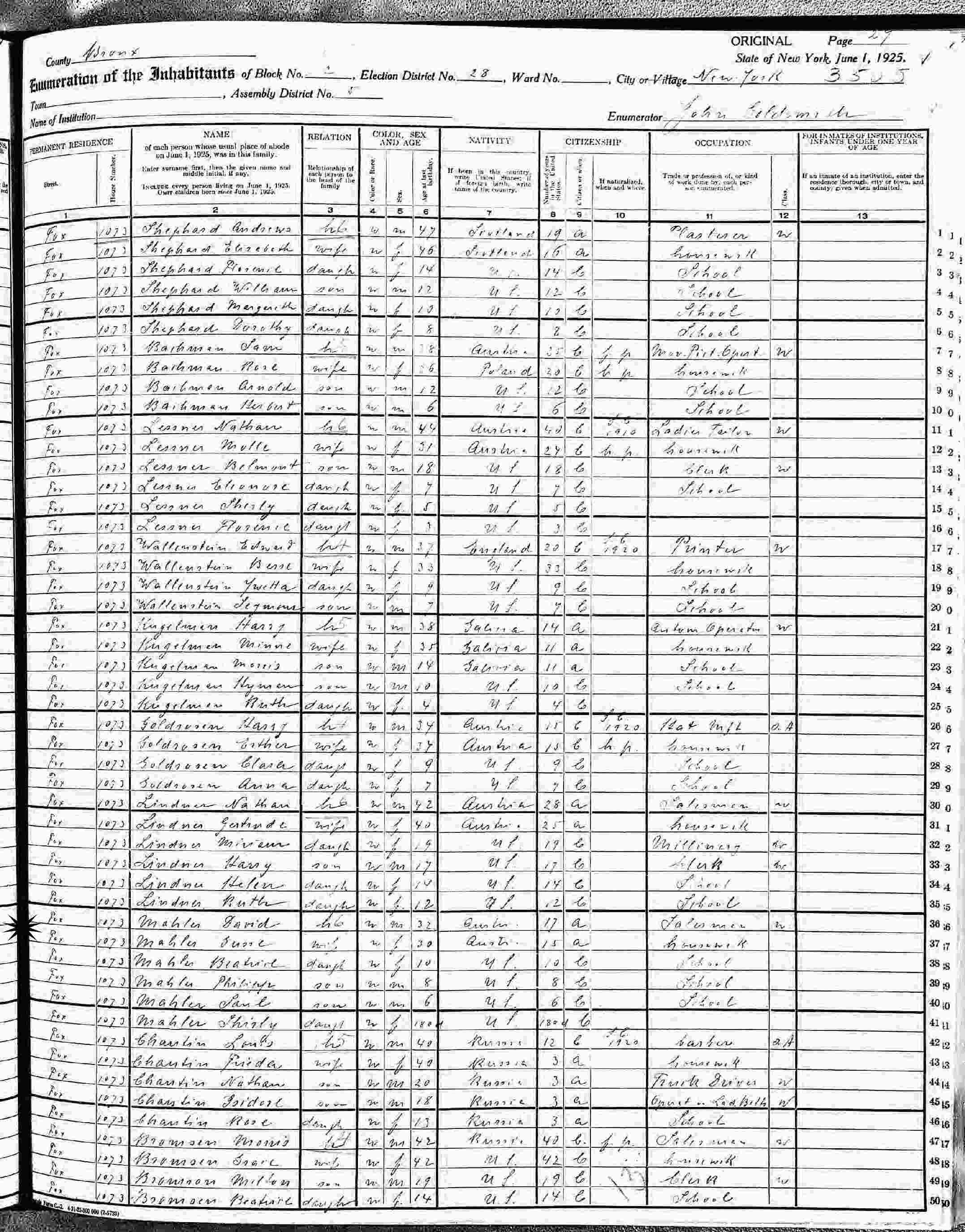 June 1, 1925 - New York State - 1073 Fox, Assembly District 5, Block 2, Election District 28, Bronx, New York.