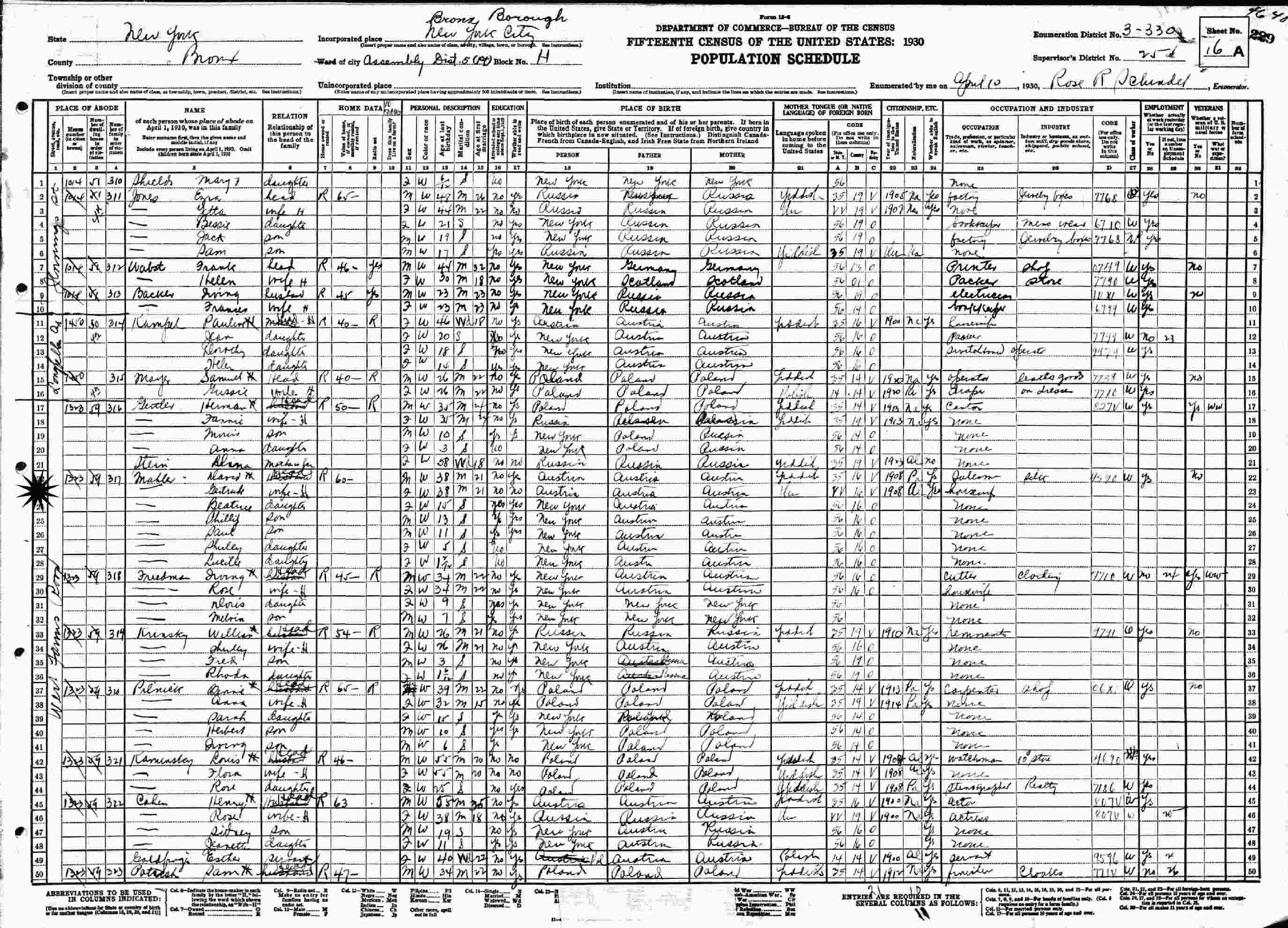 April 10, 1930 - 1323 West Farms Road (?), Assembly District 5, Block H, Supervisor's District 25, Enumeration District 3-330, Block H, Supervisor's District 25, Enumeration District 3-330, Bronx, New York City, New York.
