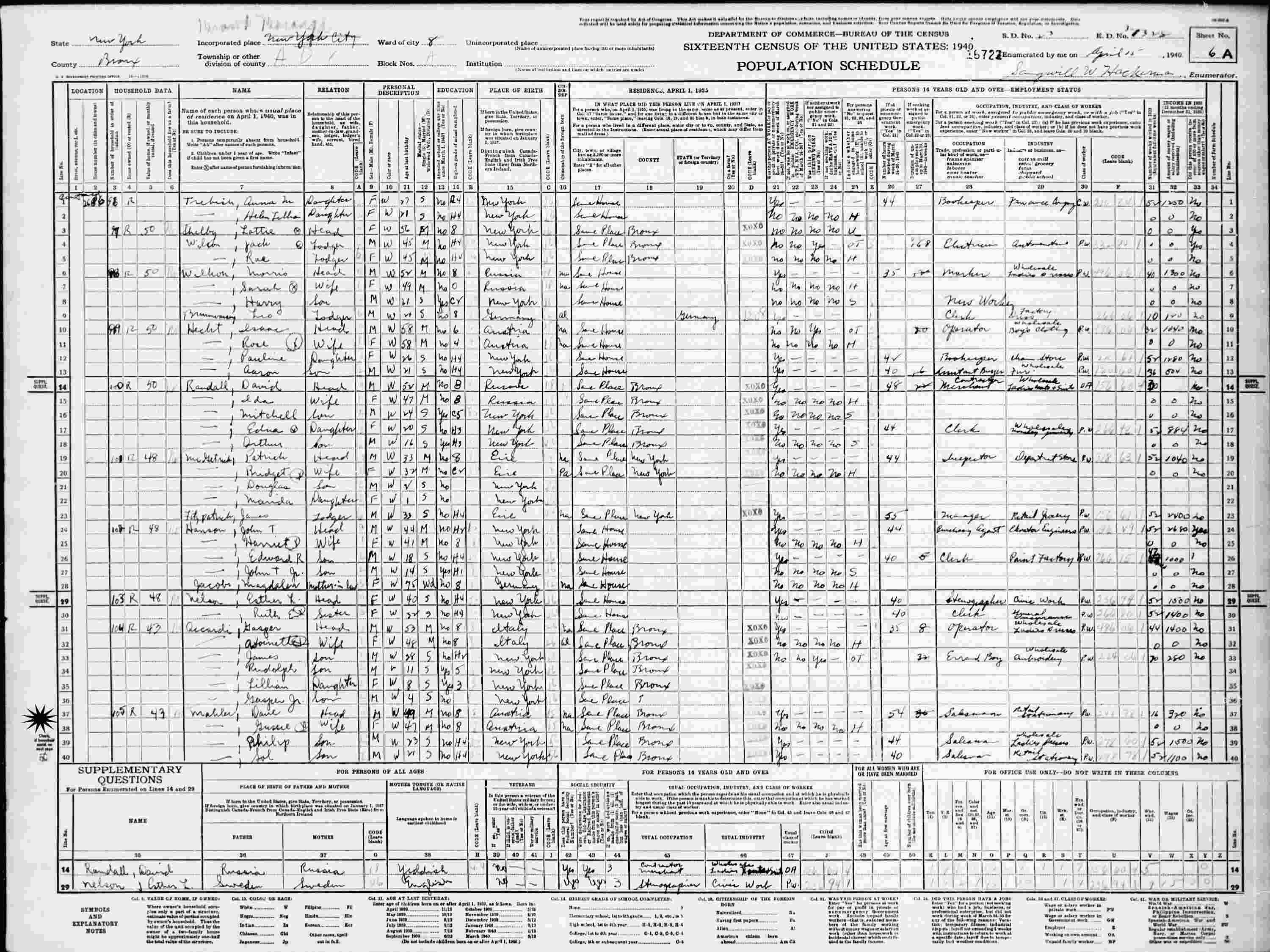 April 15, 1940 - 2686 Valentine Ave, Assembly District 8, Ward 8, Block A, Supervisor's District 23, Enumeration District 3-1328, Bronx, New York.