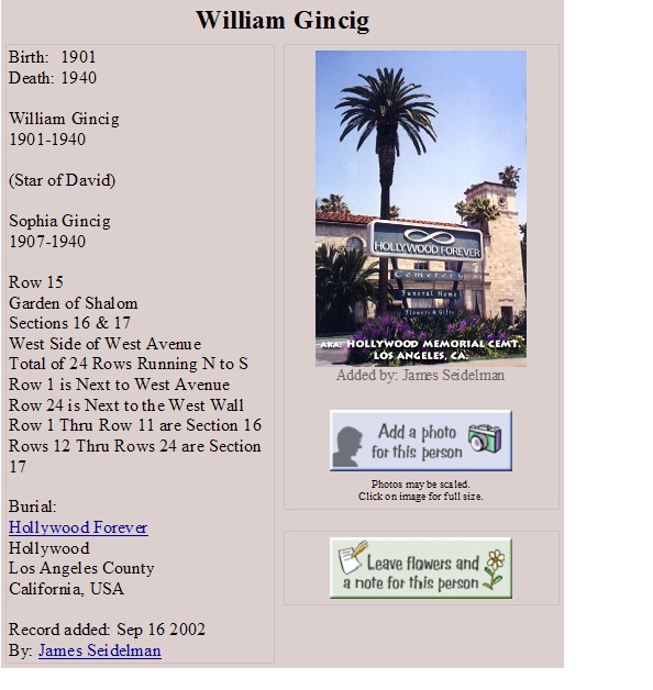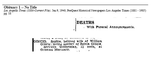 Married: Ira William Gincig July 29, 1923 in Los Angeles, Los Angeles County, California. (Divorce: filed Abt Dec 21, 1929 but looks like never divorced)