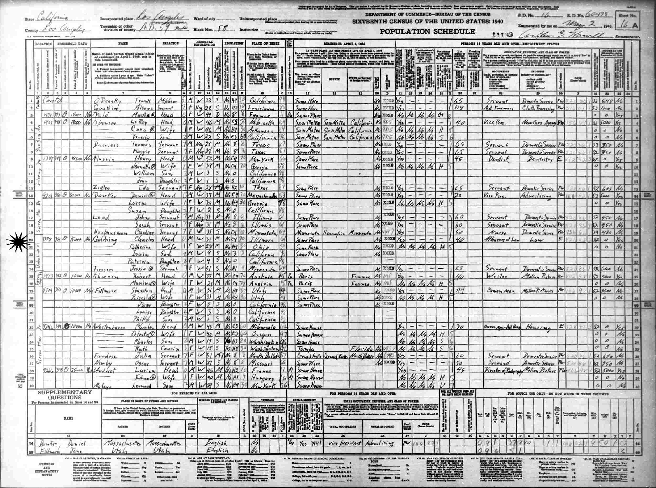 May 2, 1940 - 1378 Bobolink Place, Assembly District 59, Block 58, Councilmanic District 2, Supervisor's District 16, Enmeration District 60-173, Los Angeles, Los Angeles County, California.