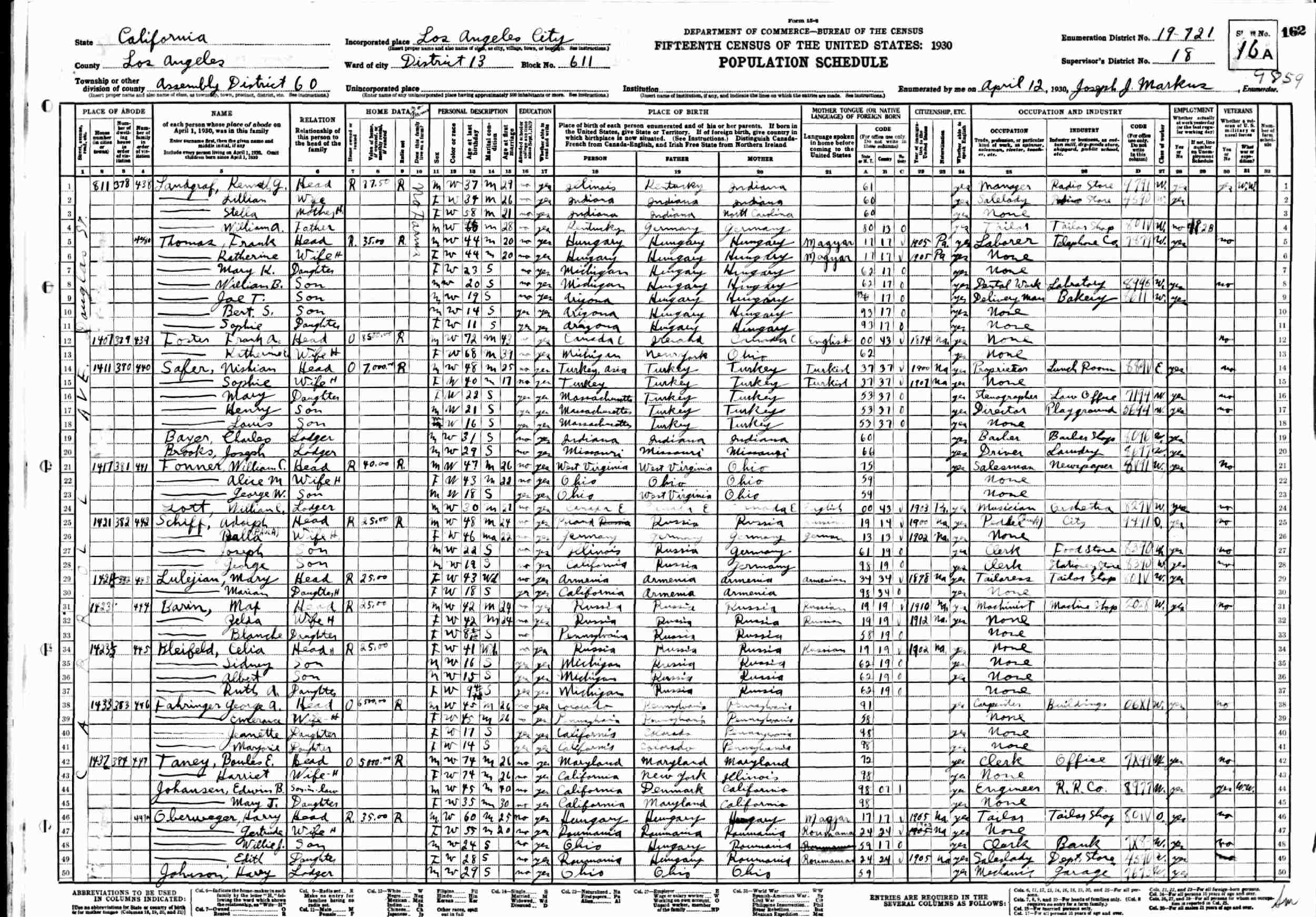 April 12, 1930 - 1421 Carroll Avenue, Assembly Disstrict 60, District 13, Block 611, Los Angeles, Los Angeles County, California.