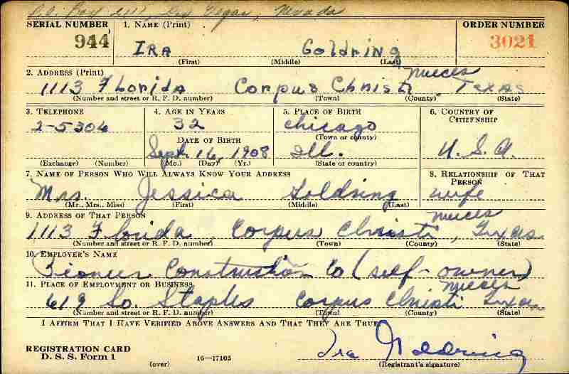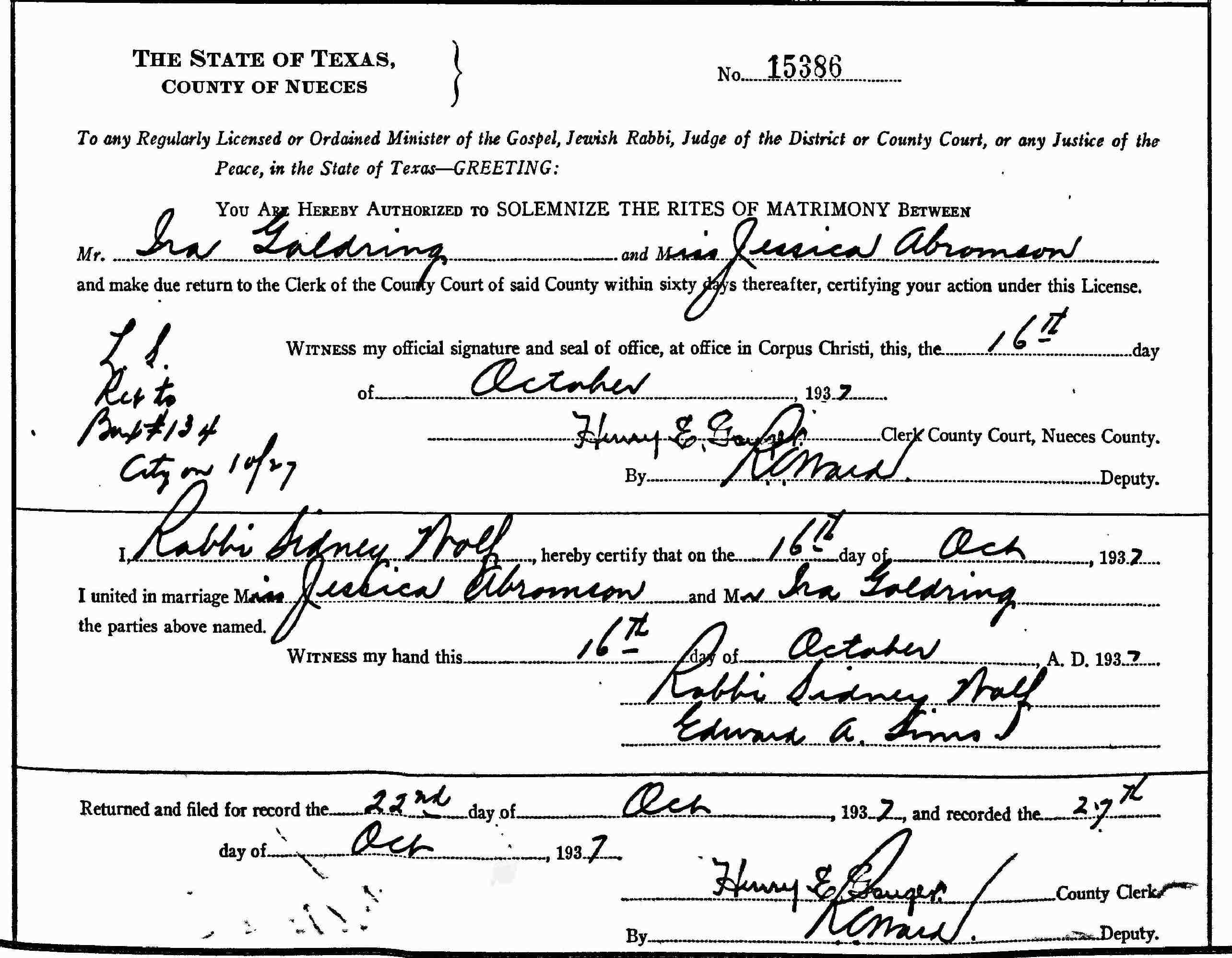 Married: (1) Jessica Abramson October 16, 1937 in Nueces County, Texas.