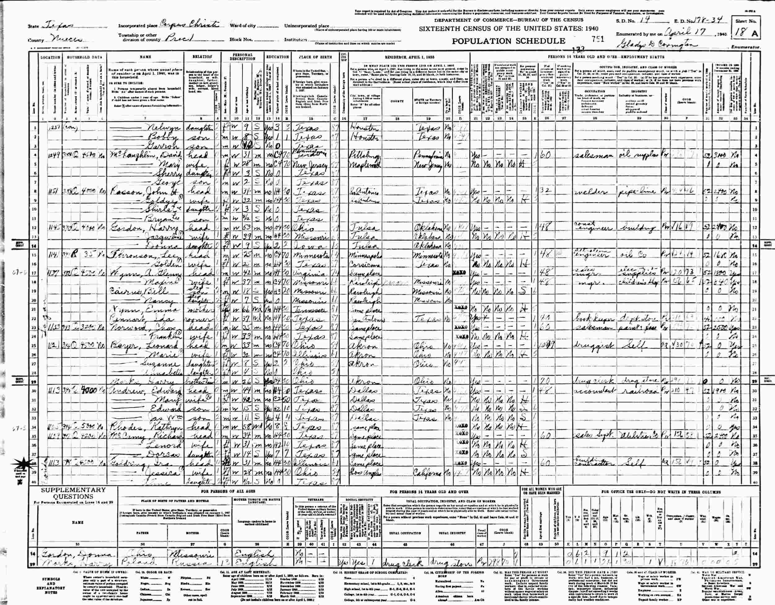 April 17, 1940 - 1113 Florida, Precinct 1, Supervisor's District 14, Enumeration District 178-34, Corpus Christi, Nueces County, Texas.