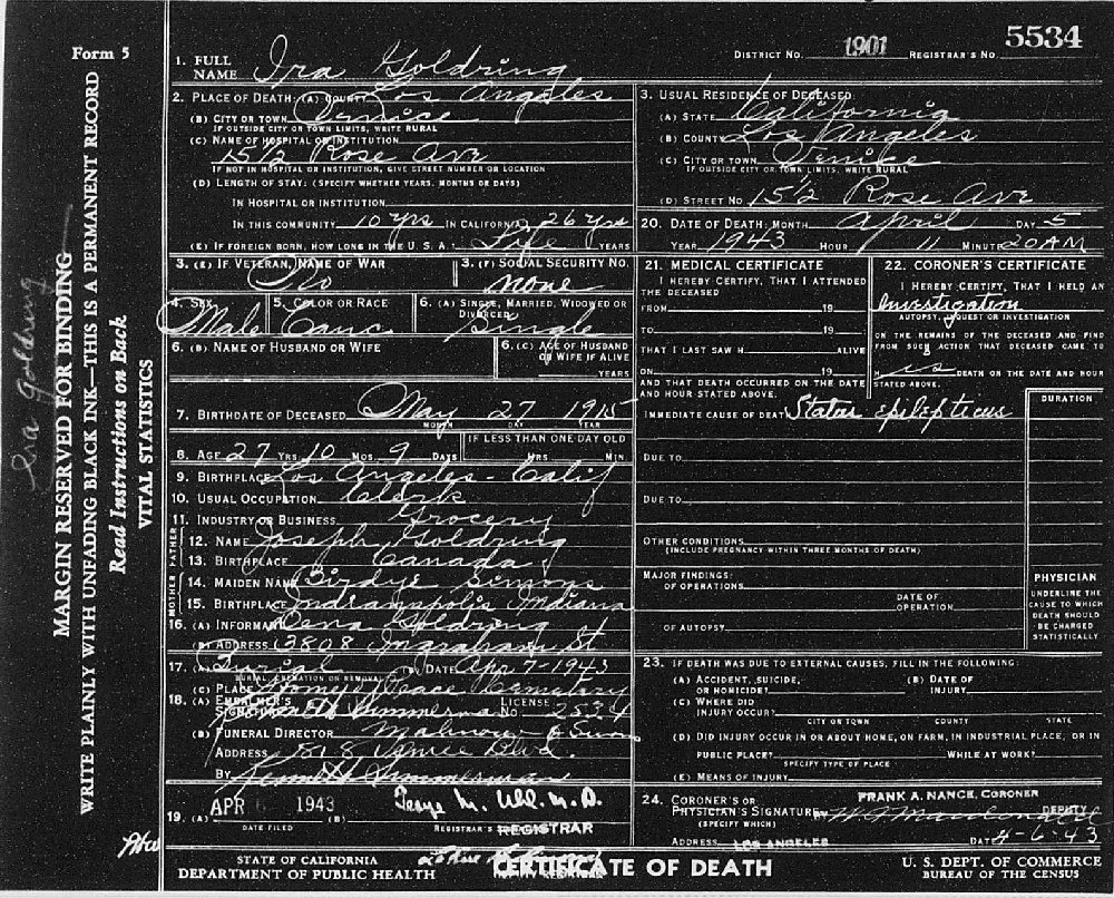 Last Residence: 15 1/2 Rose Avenue, Venice, Los Angeles County, California.