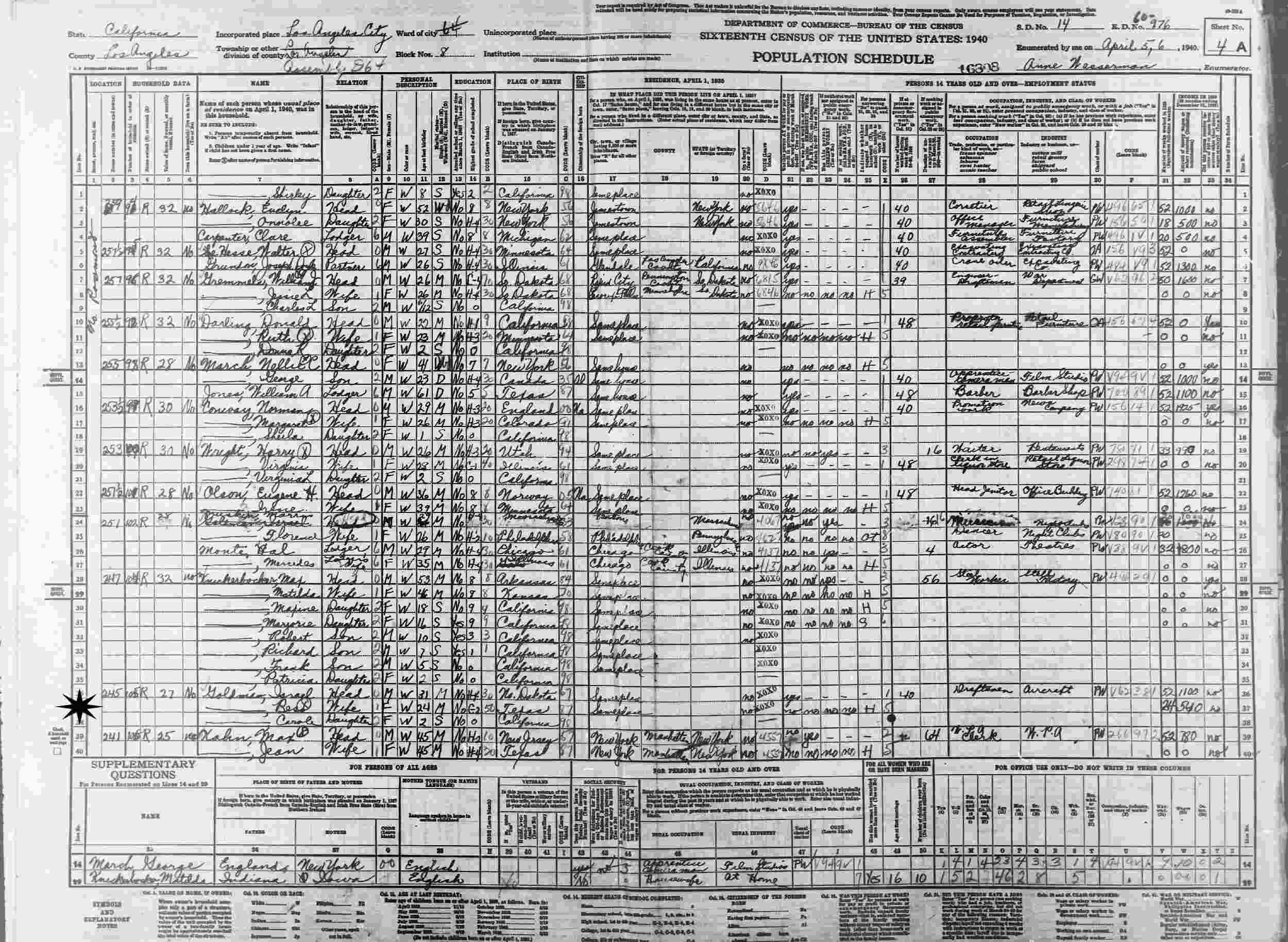 April 5-6, 1940 - 245 N. Rosemont, Assempbly District 64, Supervisor's District, Enumeration District 60-976, Los Angeles, Los Angeles County, California.