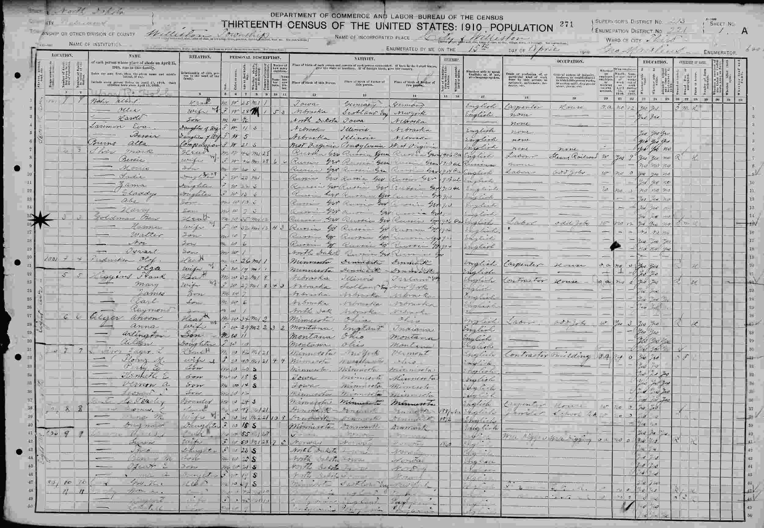April 25, 1910 - 1021 Seventh Avenue, Ward 3, Supervisor's District 213, Enumeration District 221, Williston, Williams County, North Dakota.