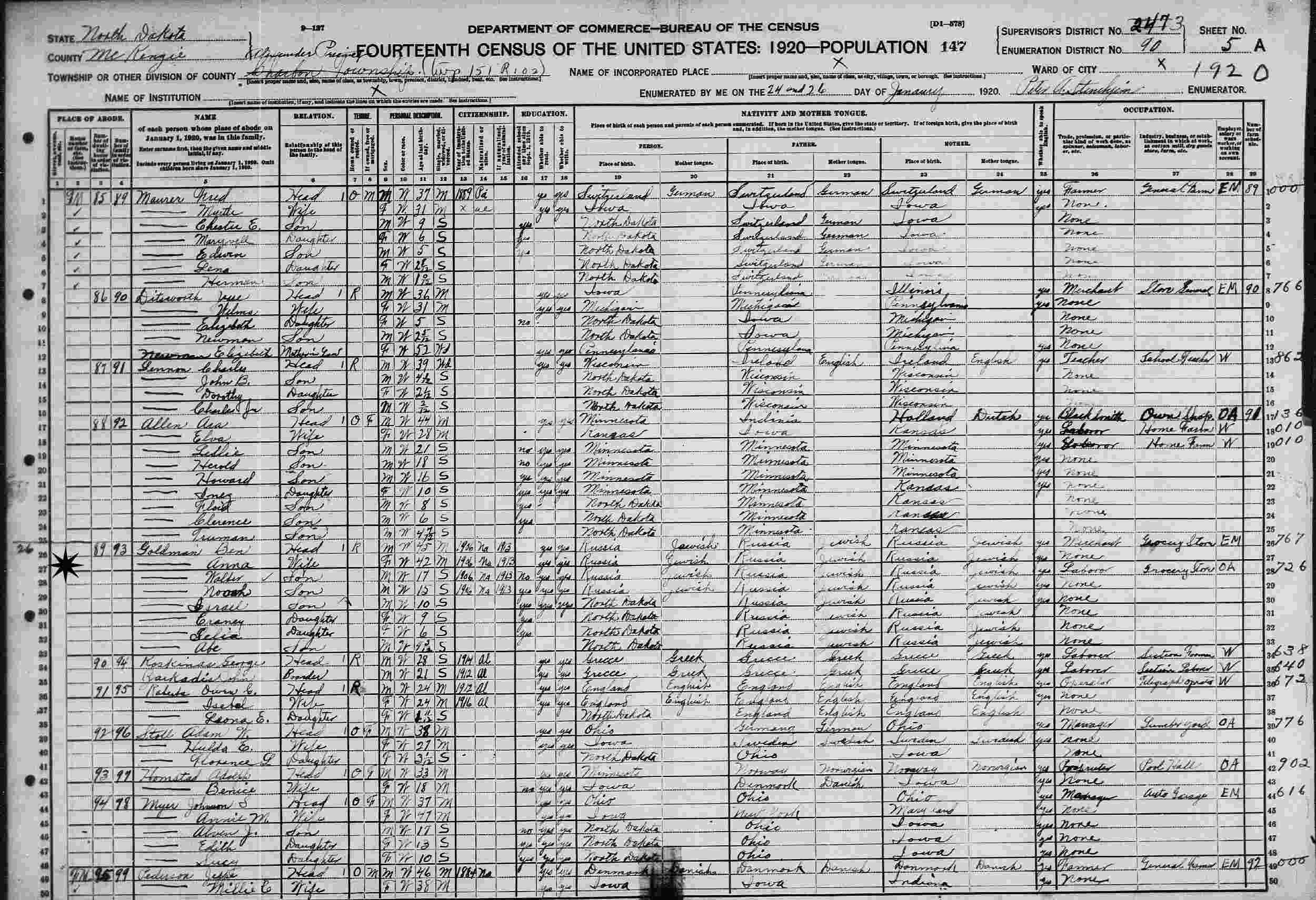 January 24-26, 1920 - Supervisor's District 247 (crossed out to 3), Enumeration District 90, Township 151, R 102, Alexander Precinct, McKenzie County, North Dakota.