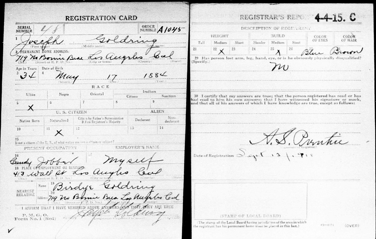 September 12, 1918 - Self Employed - Candy Jobber (413 Wall Street, Los Angeles, Los Angeles County, California).