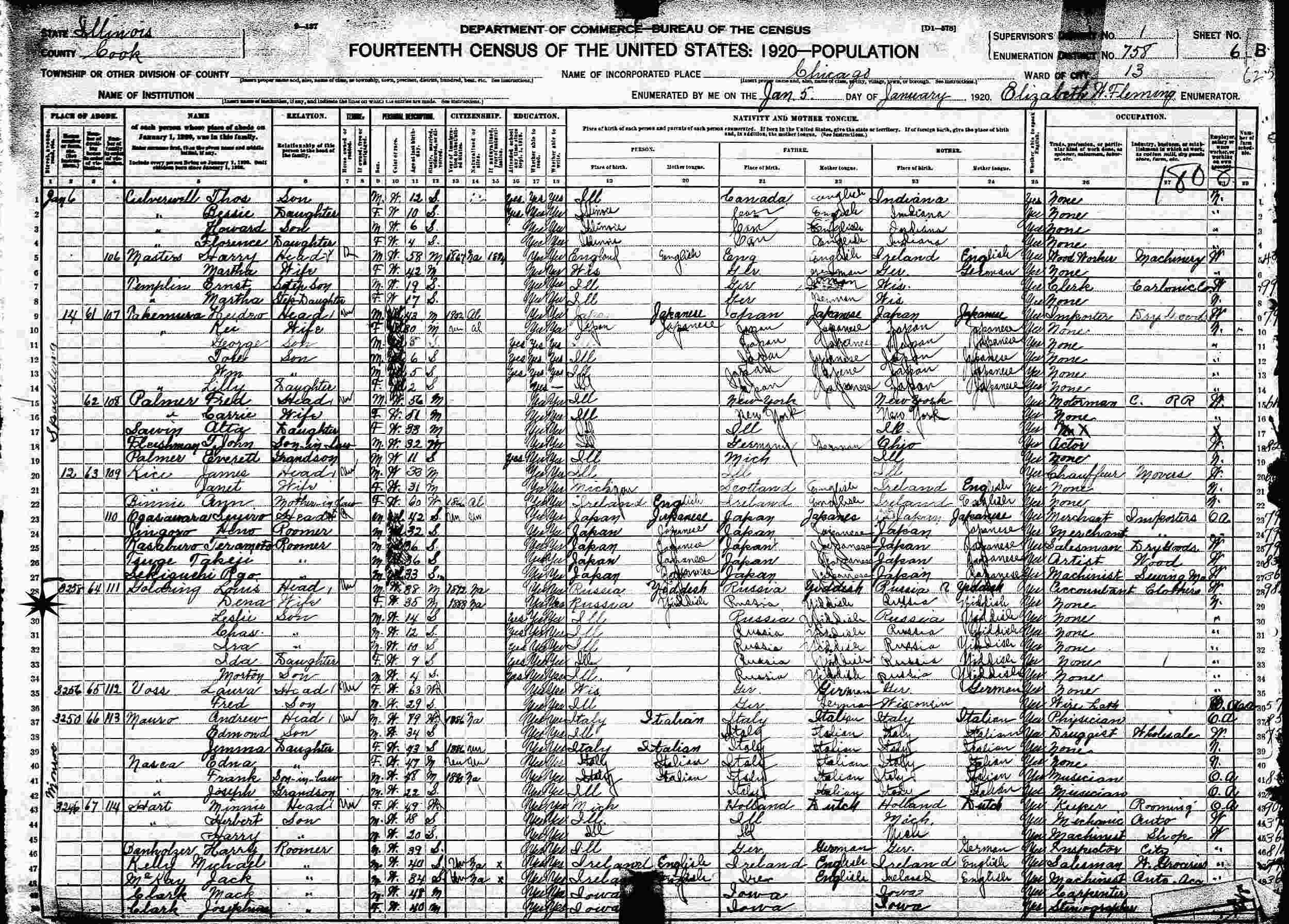 January 6, 1920 - 3258 Monroe, Ward 13, Supervisor's District 1, Enumeration District 758, Chicago, Cook County, Illinois.