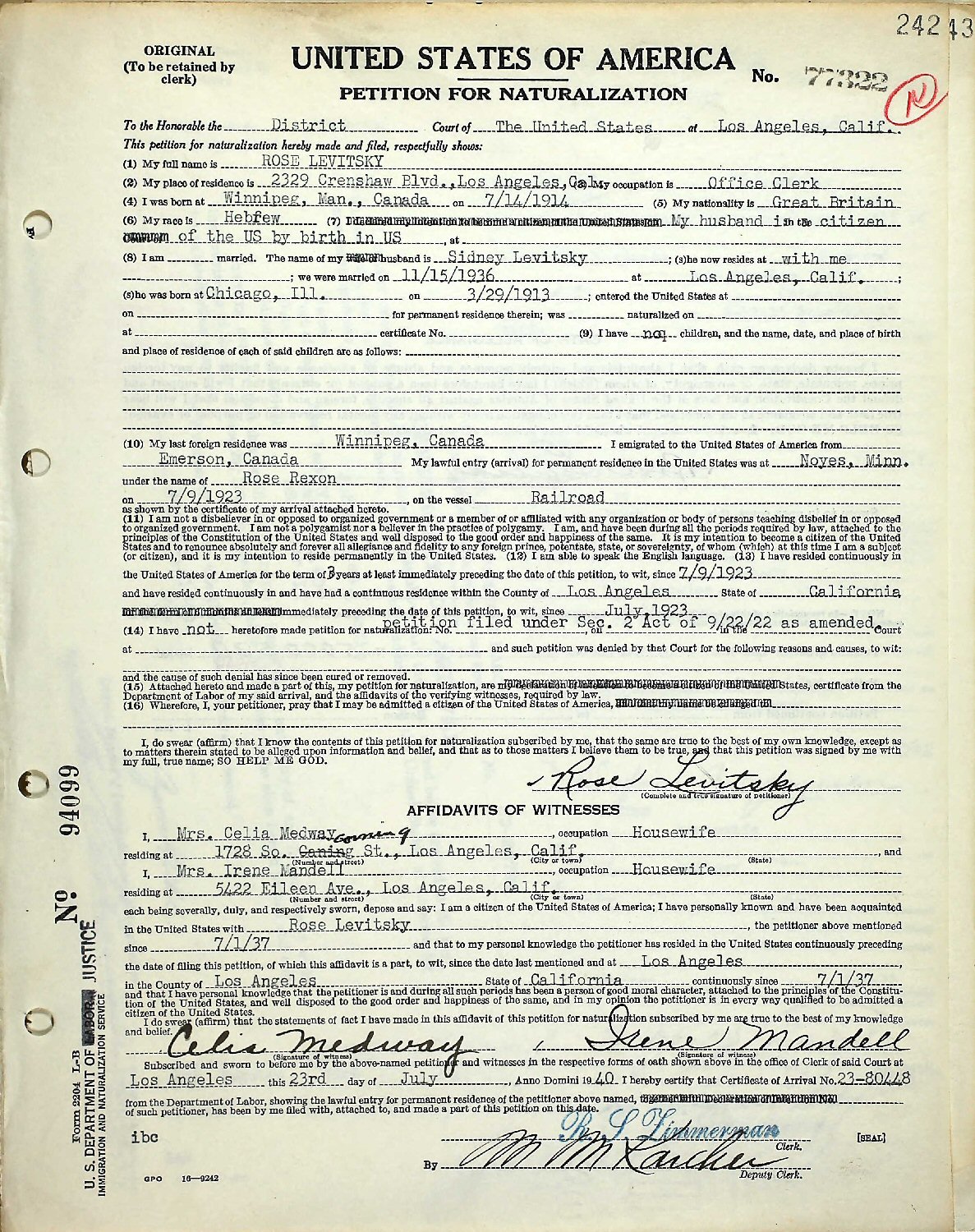 Petition For Naturalization: July 1, 1937, Los Angeles, Los Angeles County, California.