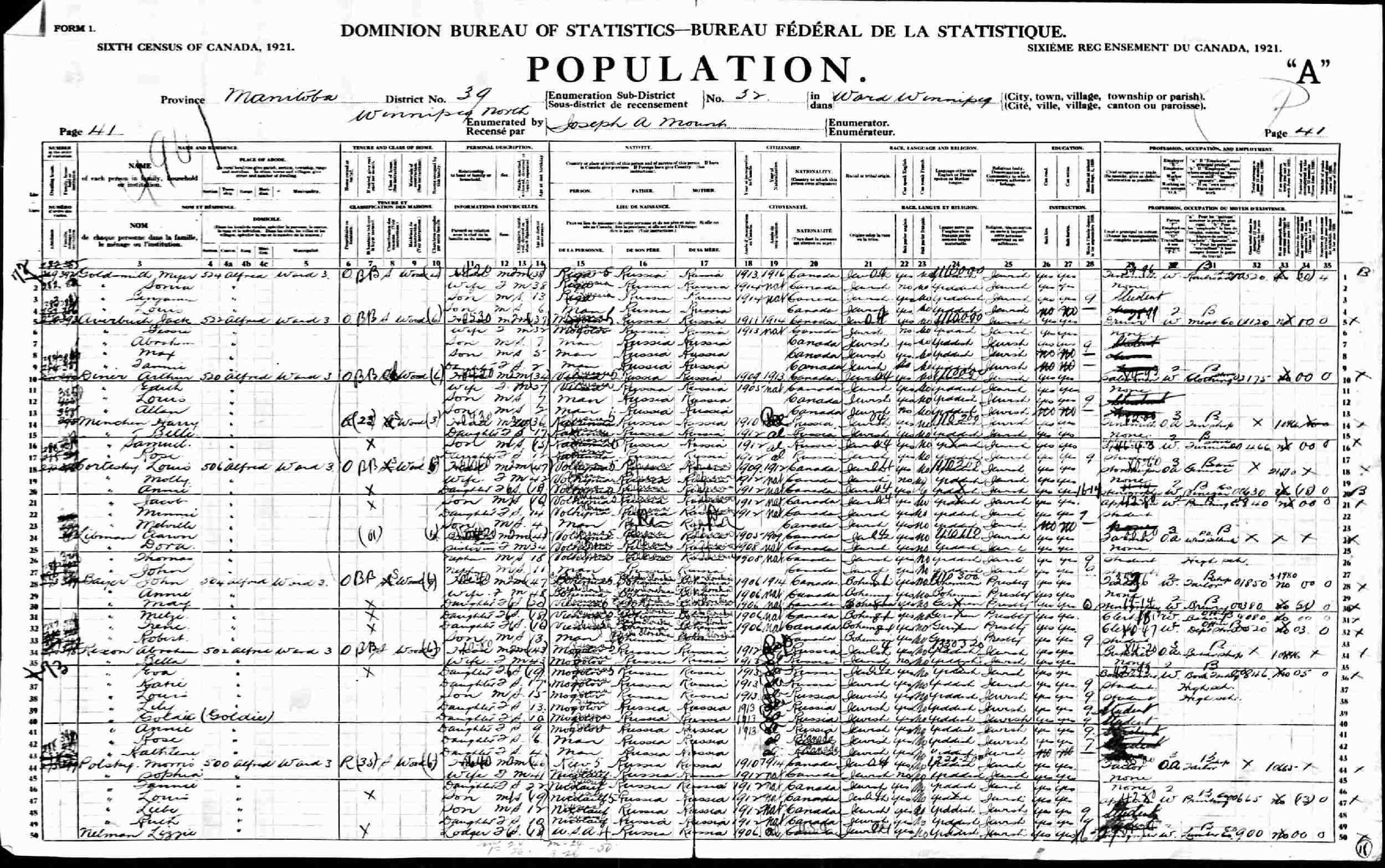 1921 - Canada - 502 Alfred, Ward 3, District 39, Sub-District 32, Winnipeg, Manitoba, Canada.