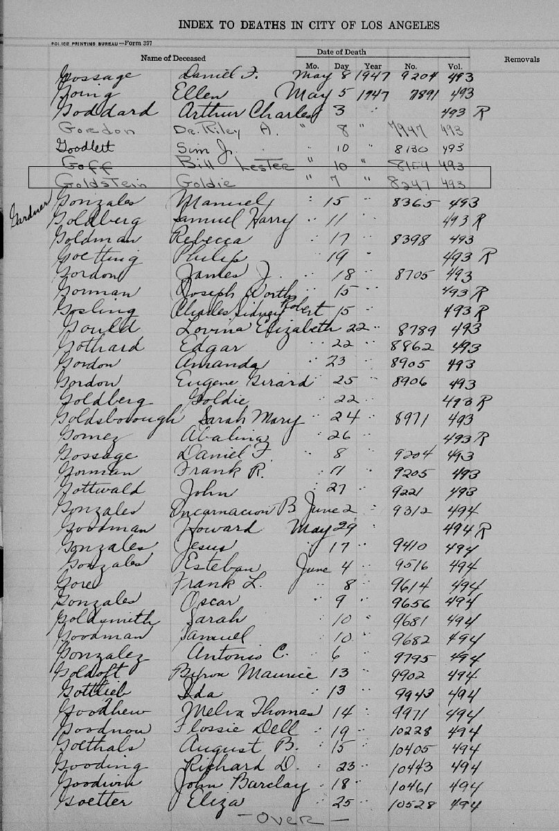 Married: Morrie Goldstein September 7, 1938 at Los Angeles, Los Angeles County, California.