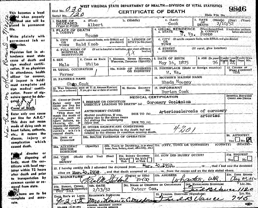 Buried: February 13, 1952 in Cook Family and James Branch Community Cemetery, Boone County, West Virginia.