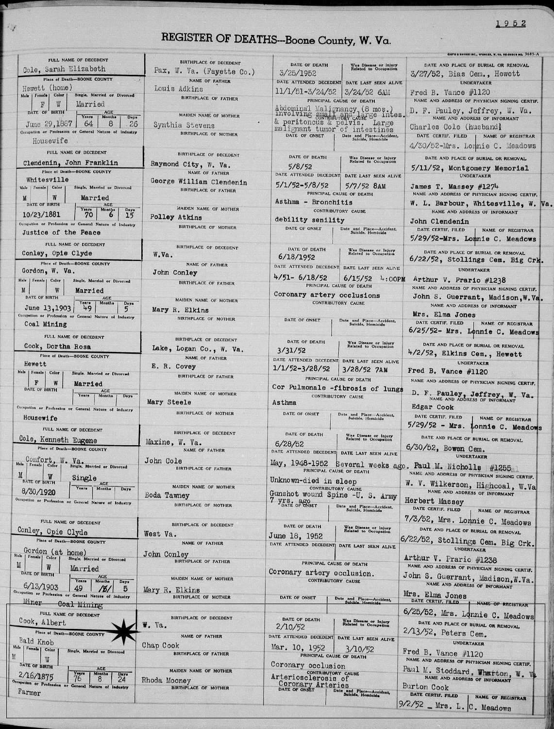 Died: February 10, 1952 in Bald Knob, Boone County, West Virginia.
