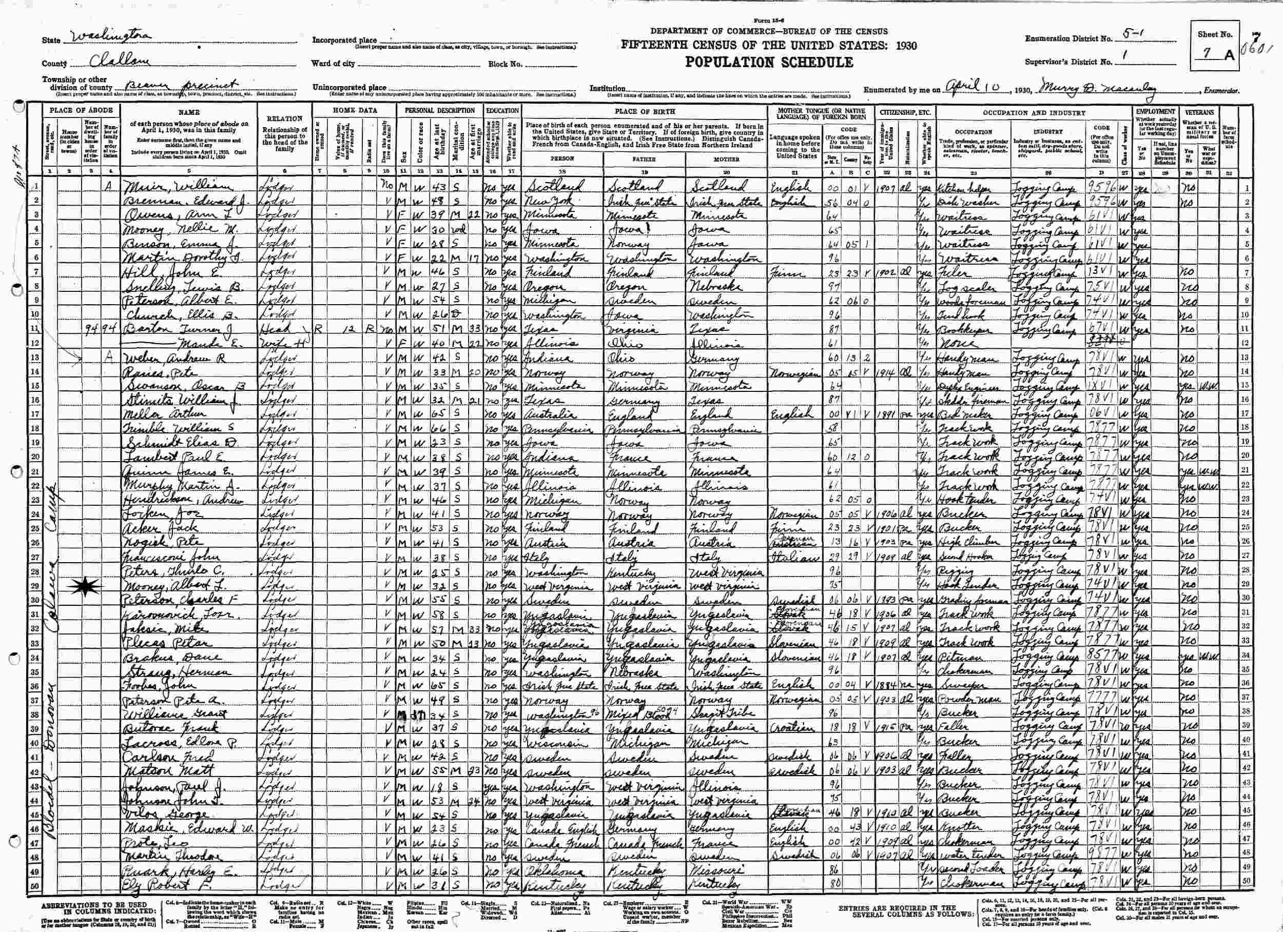 April 10, 1930 - Bloedel- Donovan Sappho Camp, Supervisor's District 1, Enumeration District 5-1, Beaver Precinct, Clallam County, Washington.