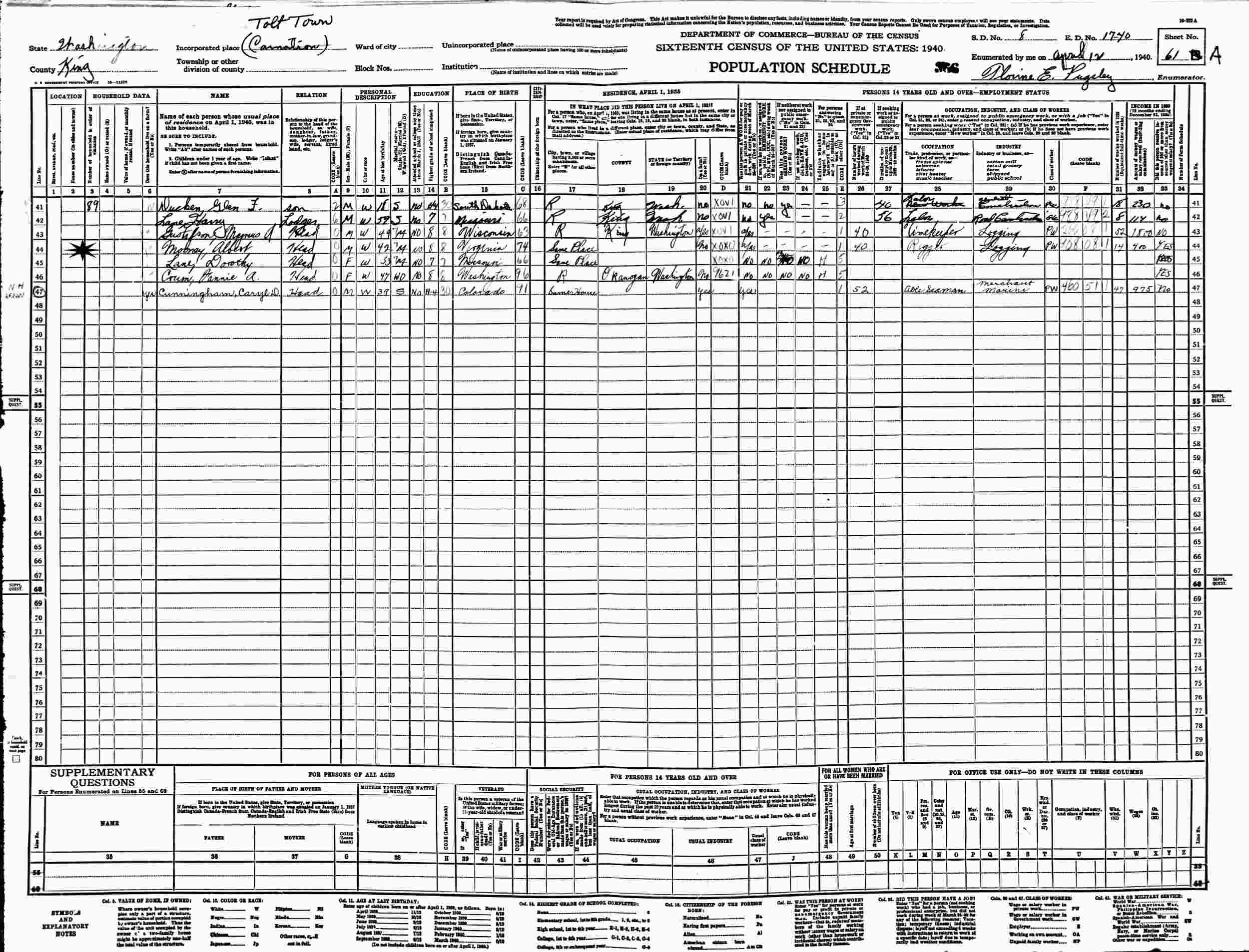 April 12, 1940 - Supervisor's District 8, Enumeration District 17-40, Tolt Town, King County, Washington.