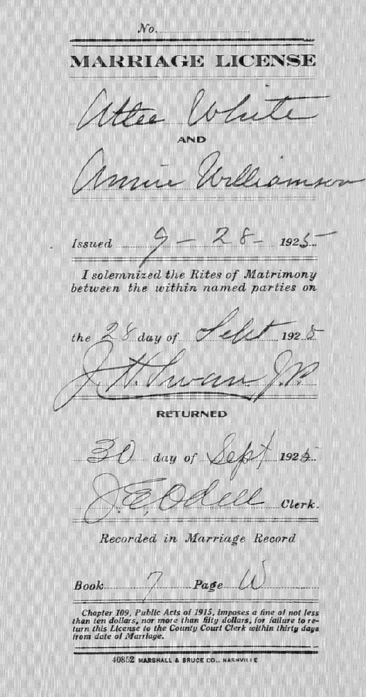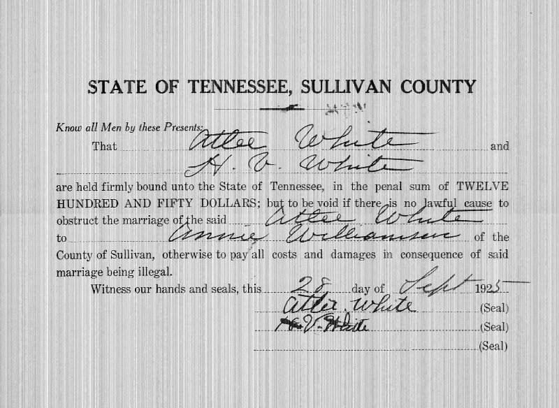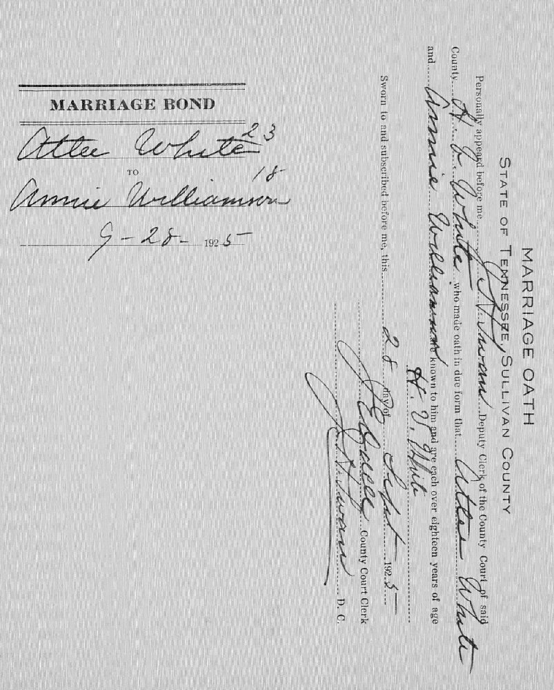 Married: Atlee Allen White September 28, 1925 in Sullivan County, Tennessee.