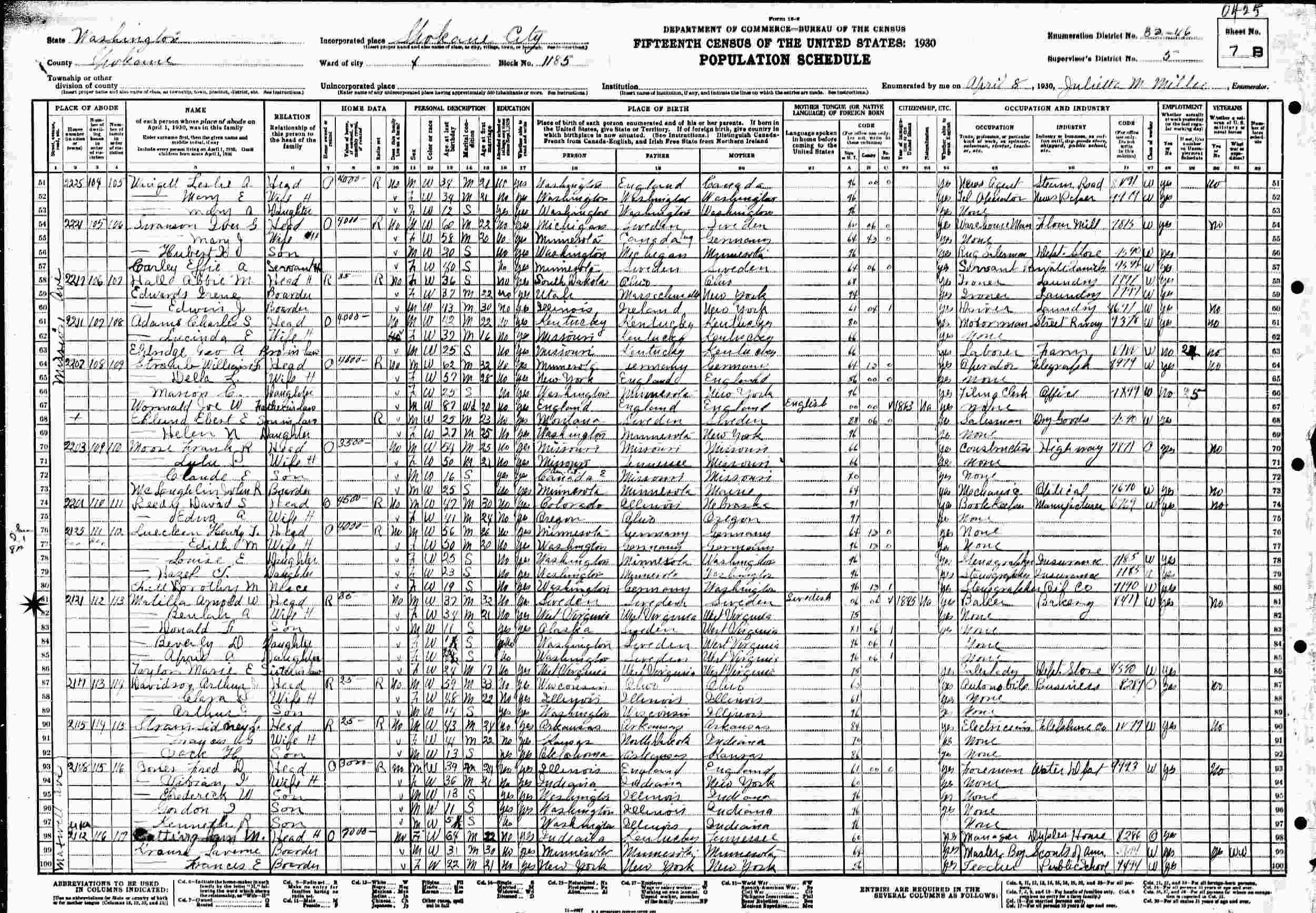 April 8, 1930 - 2121 Mission Avenue, Ward 4, Block 1185, Supervisor's District 5, Enumeration District 32-46, Spokane, Spokane County, Washington.