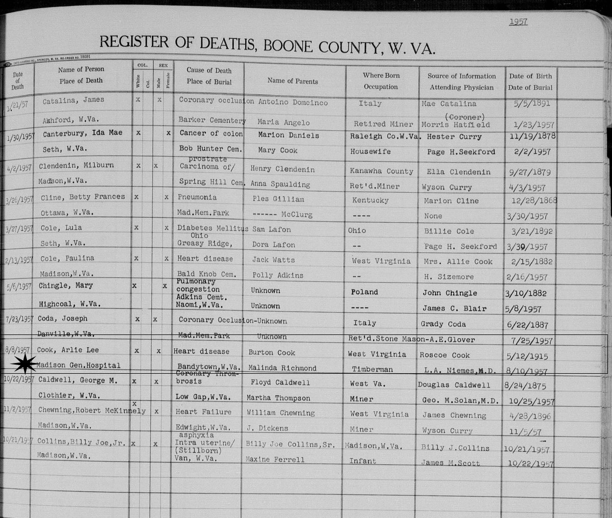 Died: August 8, 1957 in Madison General Hospital, Madison, Boone County, West Virginia.