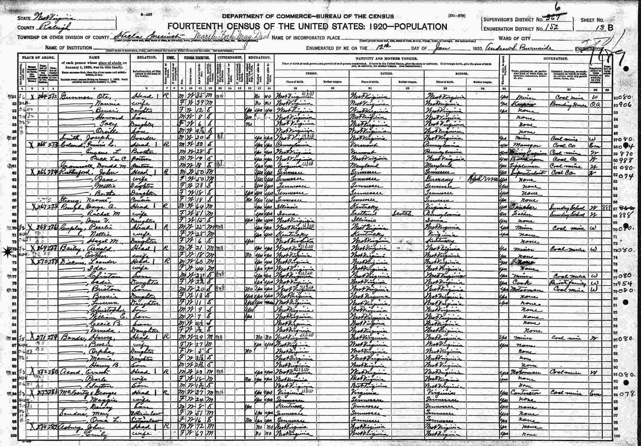 January 12, 1920 - Supervisor's District 367 (crossed out to 6), Enumeration District 152, Hecla Precinct, Marsh Fork Precinct, Raleigh County, West Virginia.