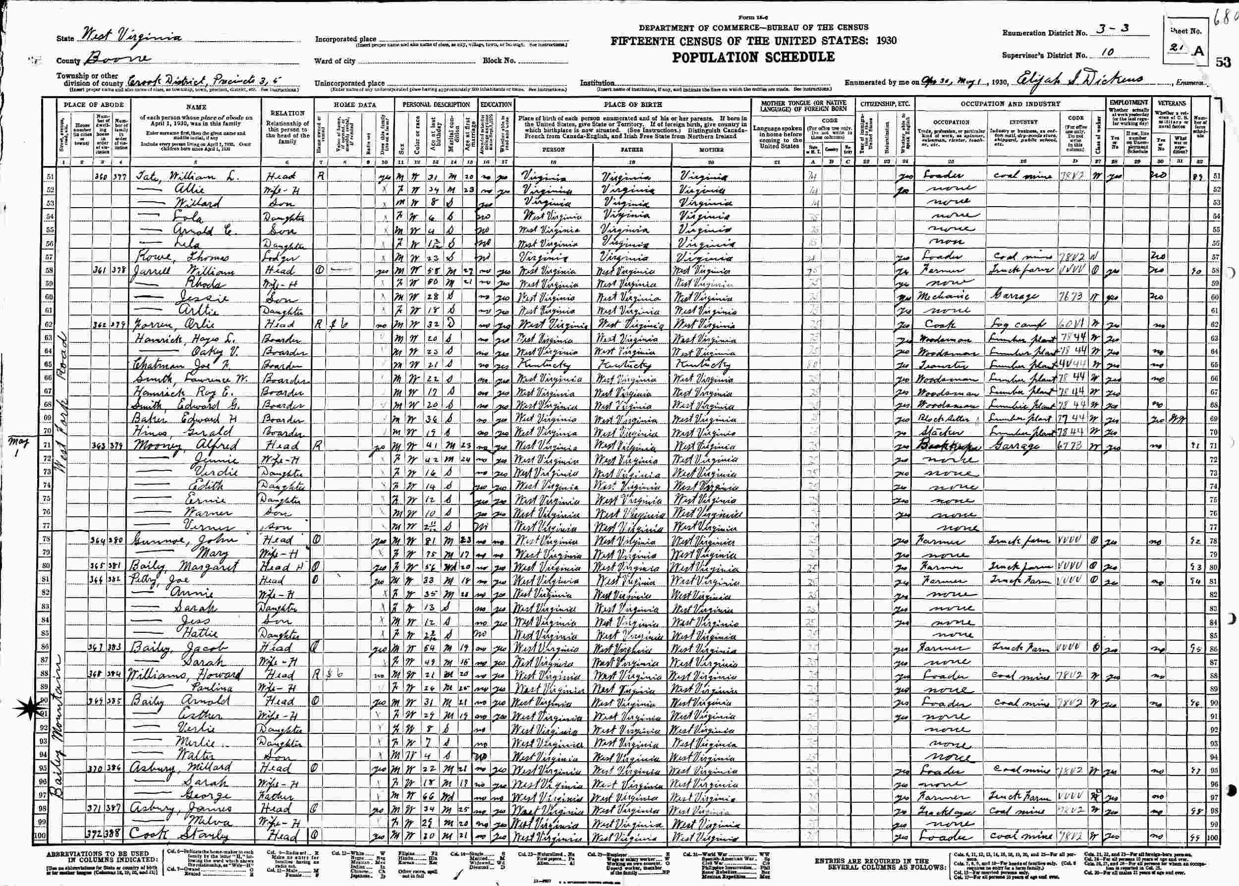 April 30-May 1, 1930 - Bailey Mountain, Crook District, Precincts 3&5, Supervisor's District 10, Enumeration District 3-3, Boone County, West Virginia.