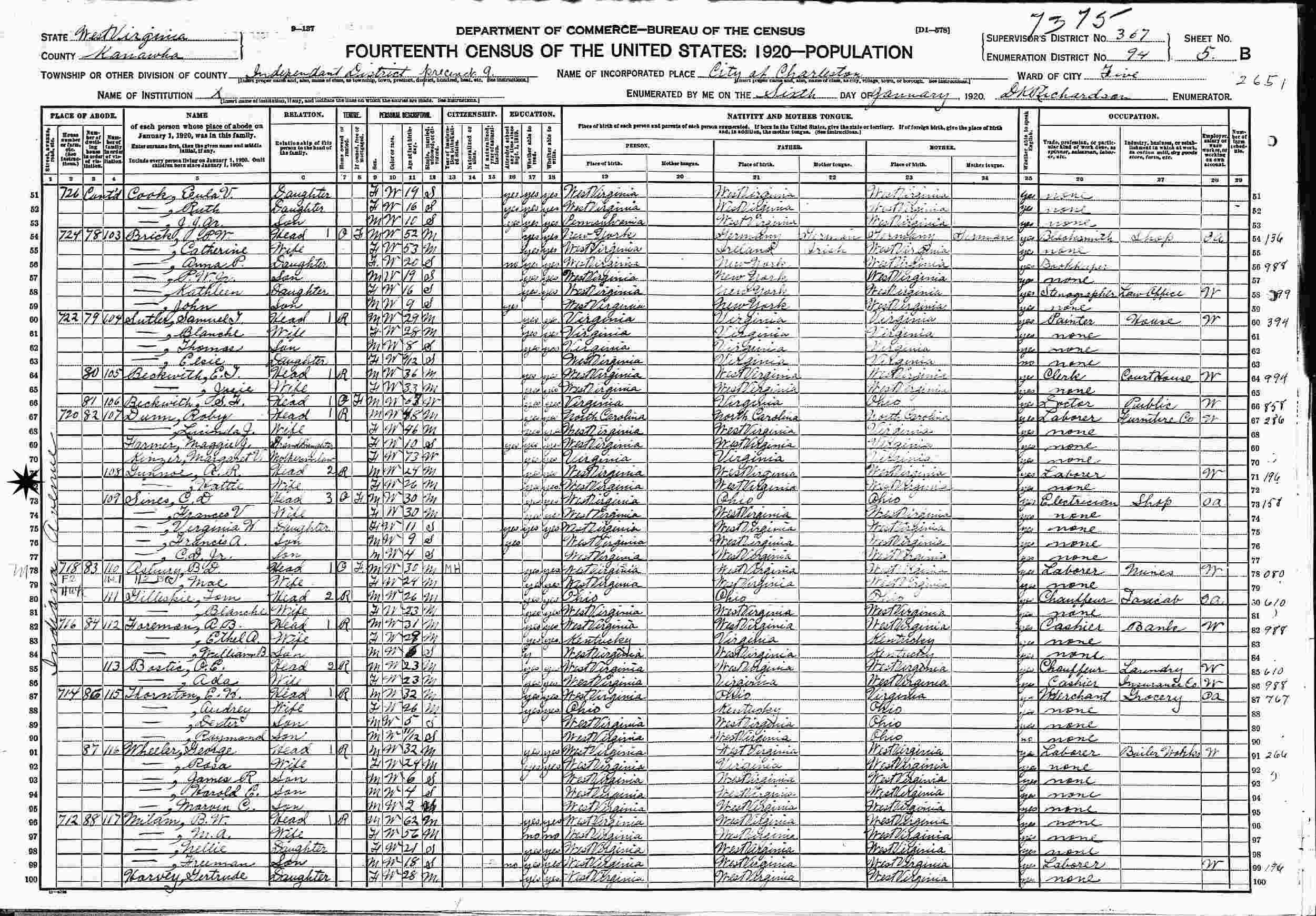 January 6, 1920 - 720 Indiana Avenue, Independent District, Charleston, Precinct 9, Ward 5, Supervisor's District 367, Enumeration District 94, Kanawha County, West Virginia.