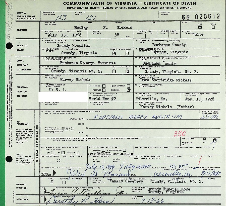Died: July 13, 1966 in Grundy, Buchanan County, Virginia.