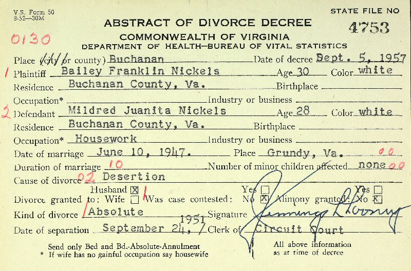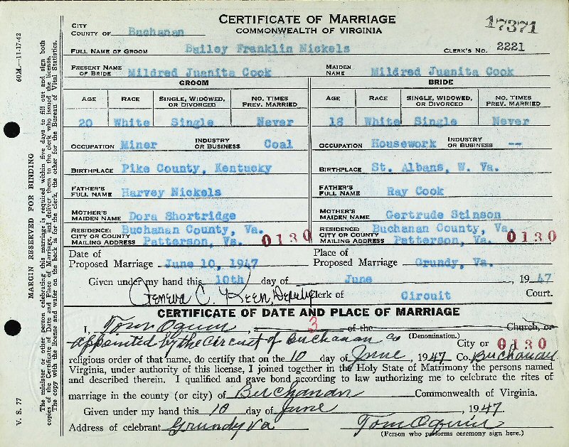 Married: (1) Mildrd Juanita Cook June 10, 1947 in Buchanan County, Virginia. (Divorce: September 5, 1957, Buchanan County, Virginia.)