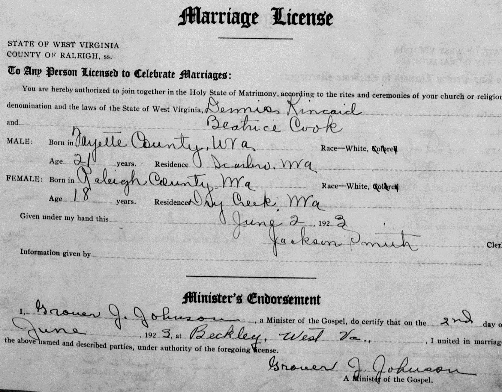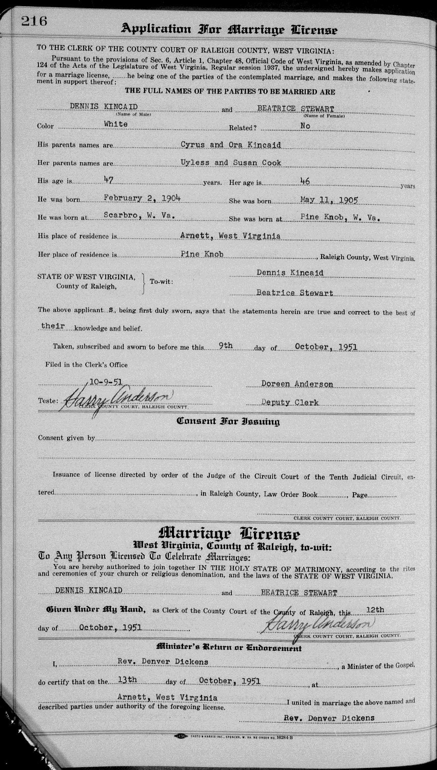 Married: (1) Dennis Kincaid June 2, 1923 in Beckley, Raleigh County, West Virginia. (Divorce before June, 1928.)