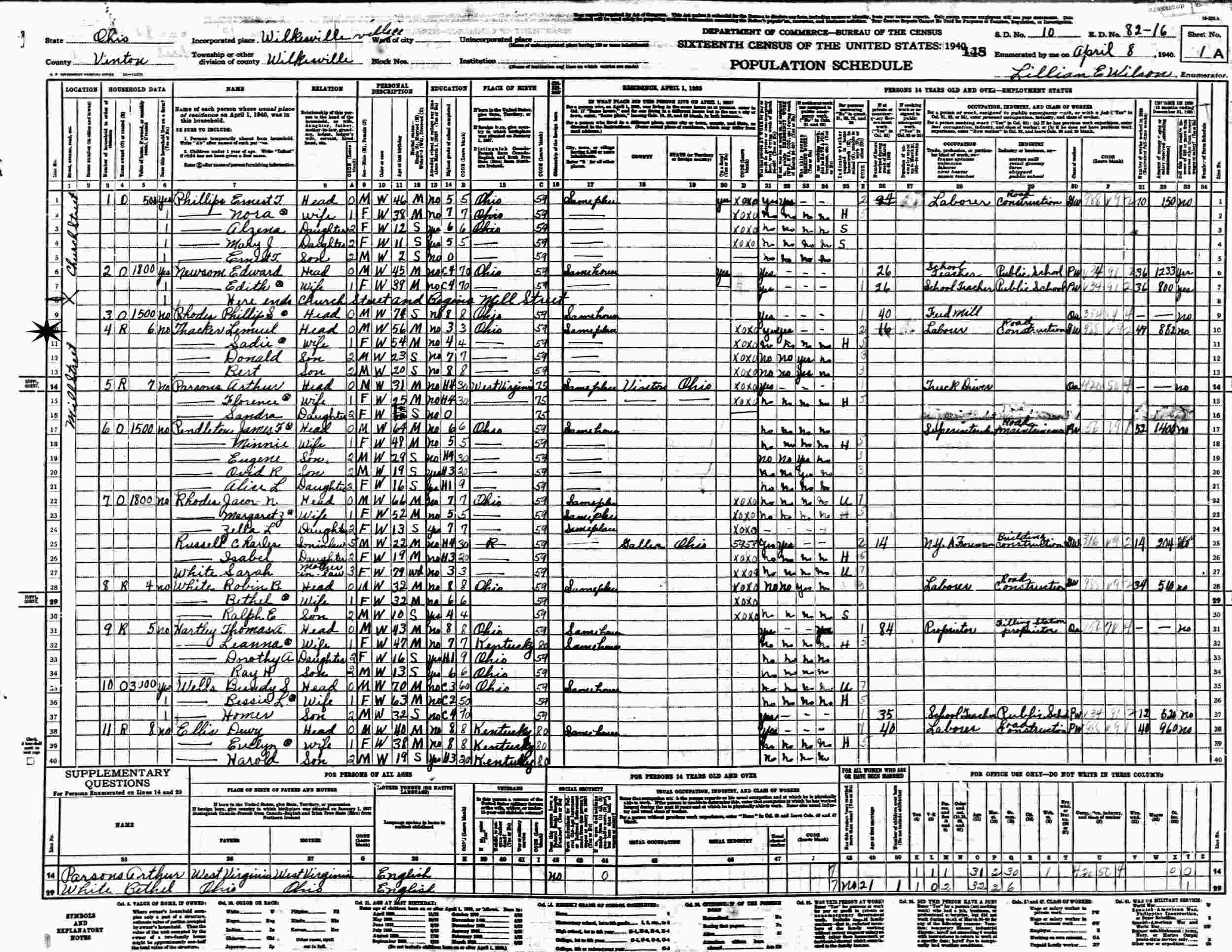April 8, 1940 - Mill Street, Supervisor's District 10, Enumeration District 82-16, Wilkesville, Vinton County, Ohio.