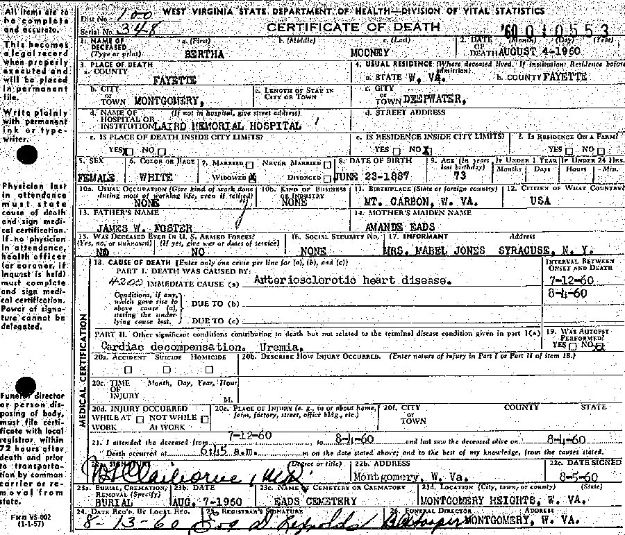 Died: August 4, 1960 in Laird Memorial Hospital, Montgomery, Fayette County, West Virginia.