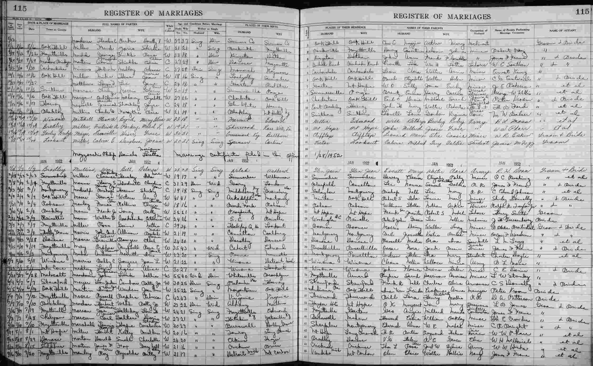 Married: Joan L Songer May 11, 1952 in Wiona, Fayette County, West Virginia. Marriage License Application: May 7, 1952. Marriage License; May 10, 1952.)