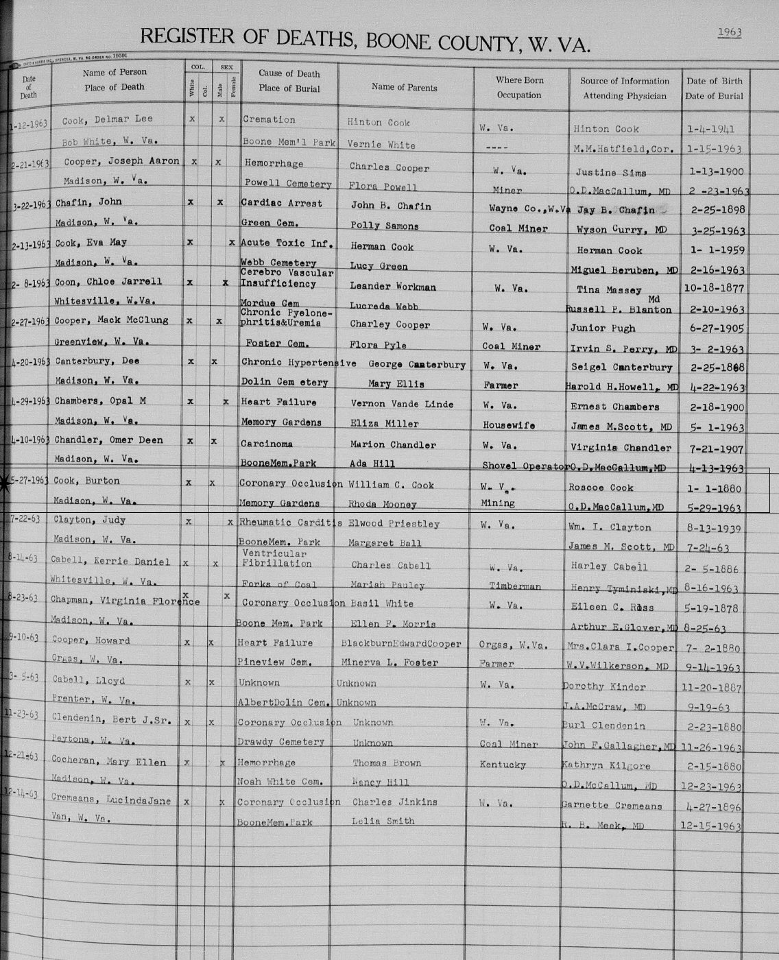 Died: May 27, 1963 in Madison, Boone County, West Virginia.