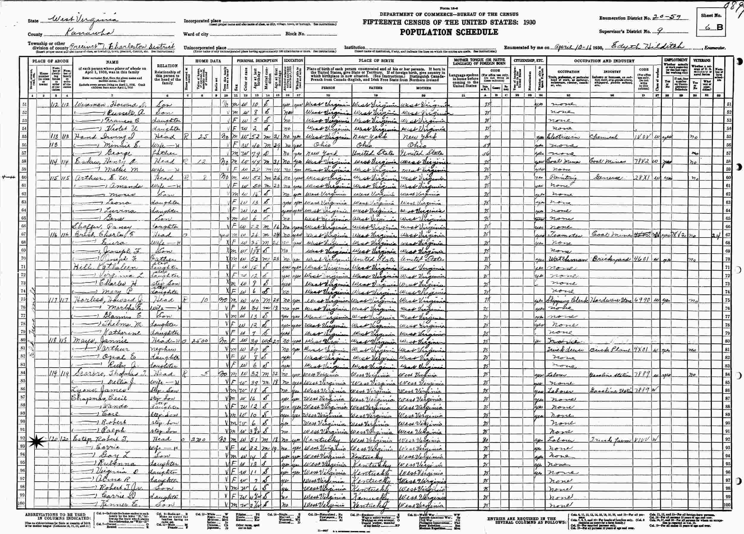 April 10-11, 1930 - Elk Two Mill, Precinct 1, Supervisor's District 9, Enumeration District 20-57, Charleston, Kanawha County, West Virginia.