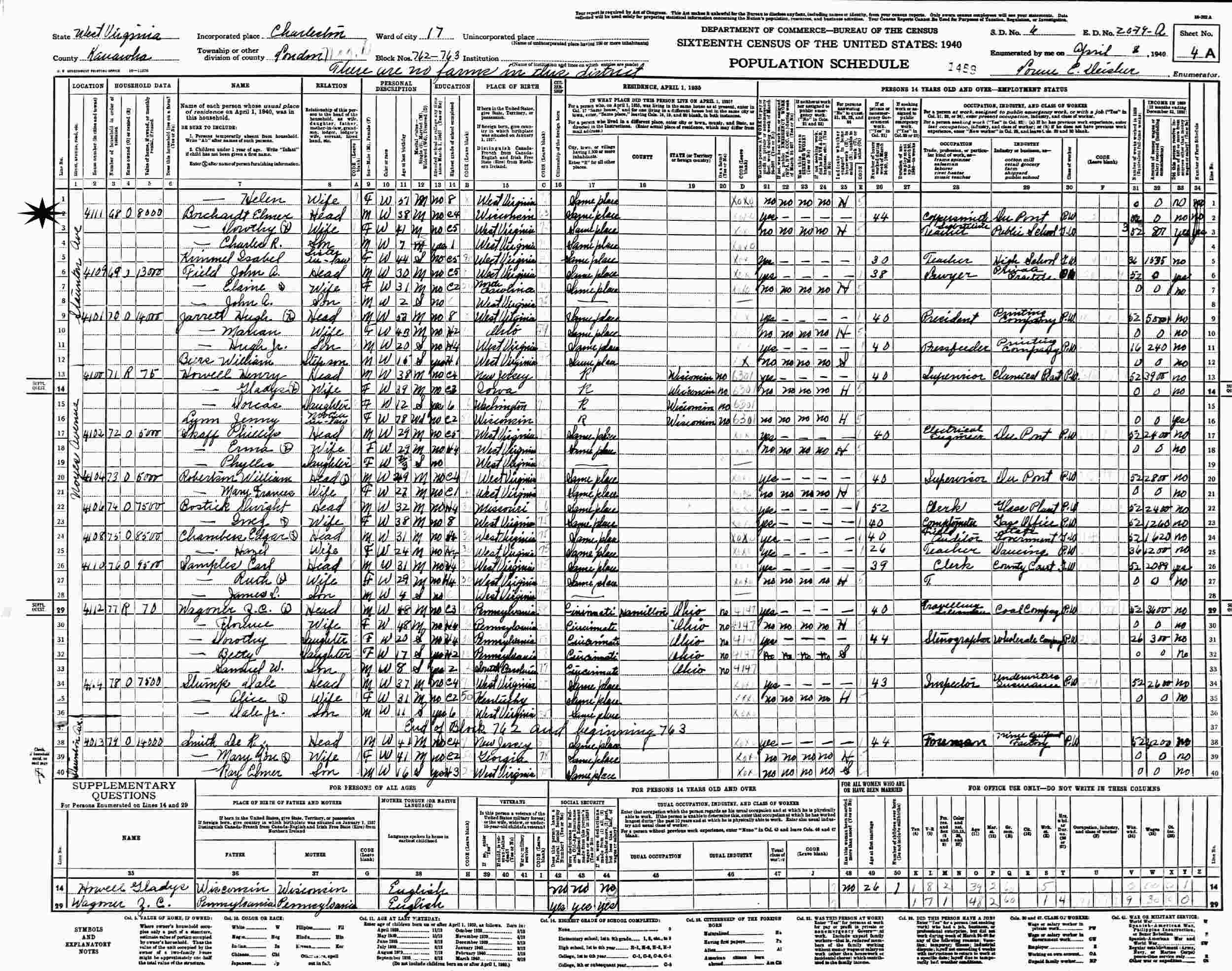 April 8, 1940 - 4111 Staunton Avenue, Ward 17, Blocks 762-763, Supervisor's District 4, Enumeration District 2-79-A, London, Charleston, Kanawha County, West Virginia.