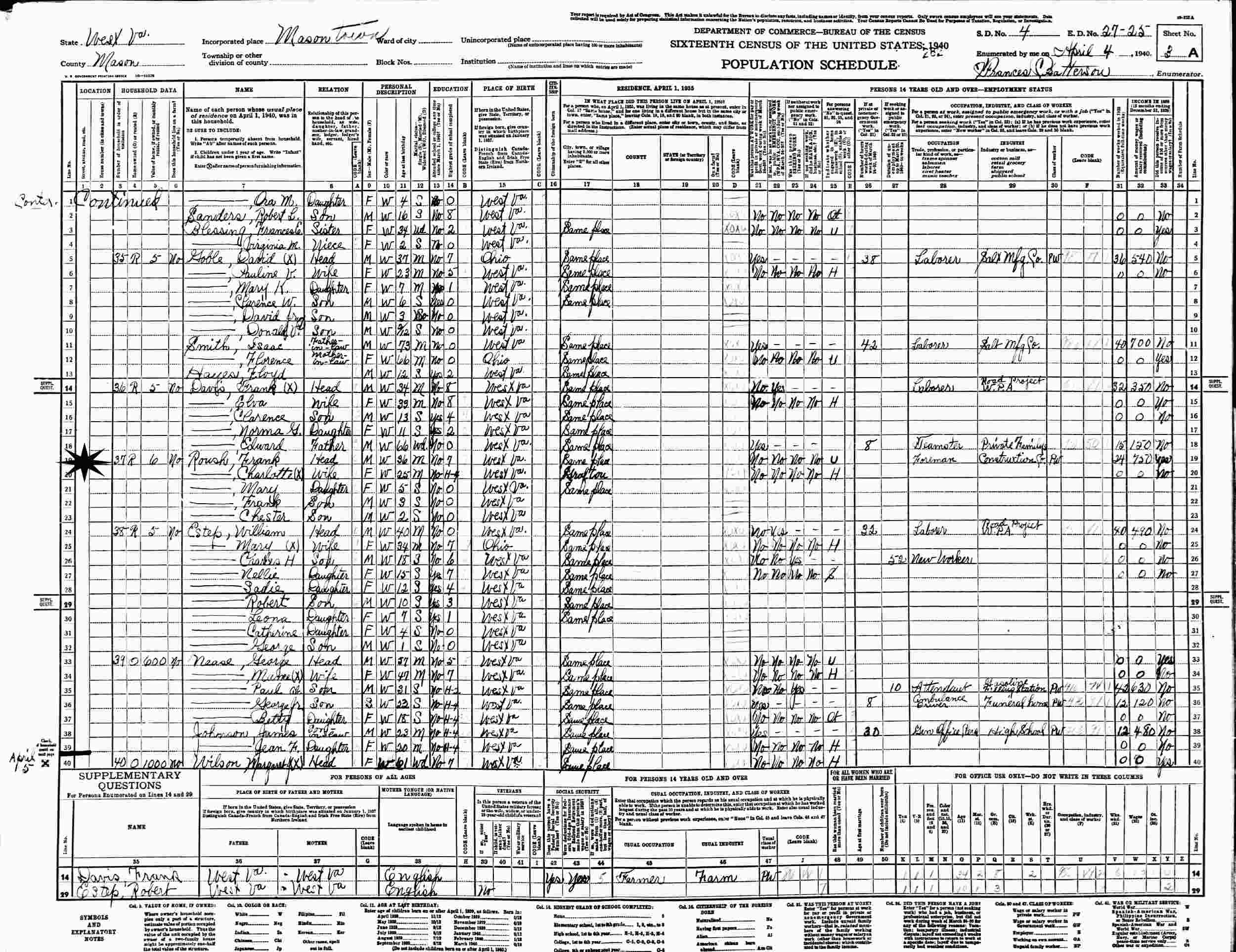 April 4, 1940 - Supervisor's District 4, Enumeration District 27-25, Mason Town, Mason County, West Virginia.
