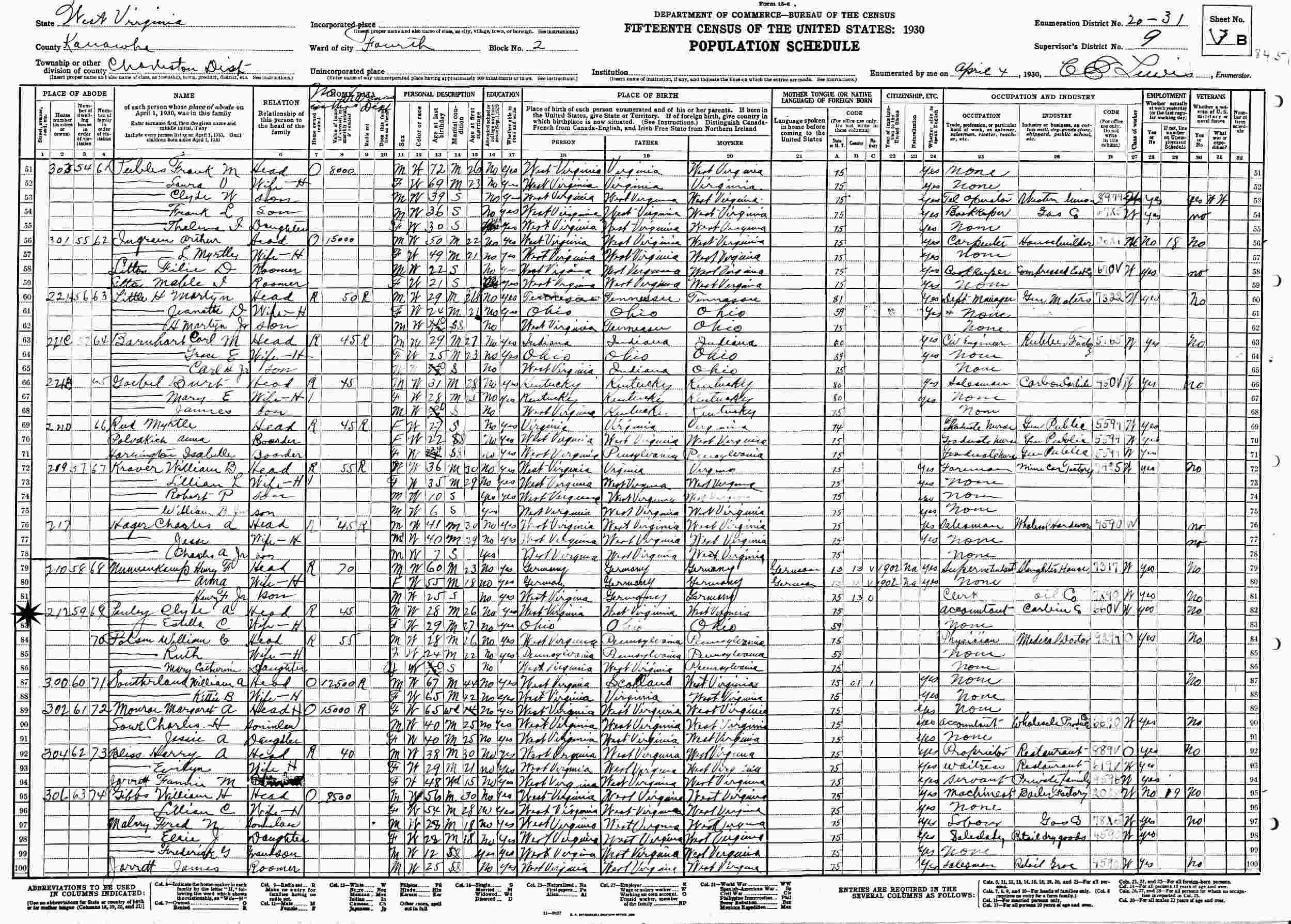 April 4, 1930 - 212 Columbia Avenue, Block 2, Fourth Ward, Supervisor's District 9, Enumeration District 20-31, Charleston, Kanawha County, West Virginia.