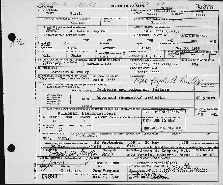 Died: May 30, 1968 at St. Luke's Hospital, Houston, Harris County, Texas.