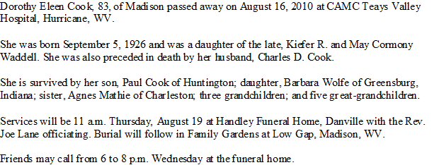 Died: August 16, 2010 in Madison, Boone County, West Virginia.