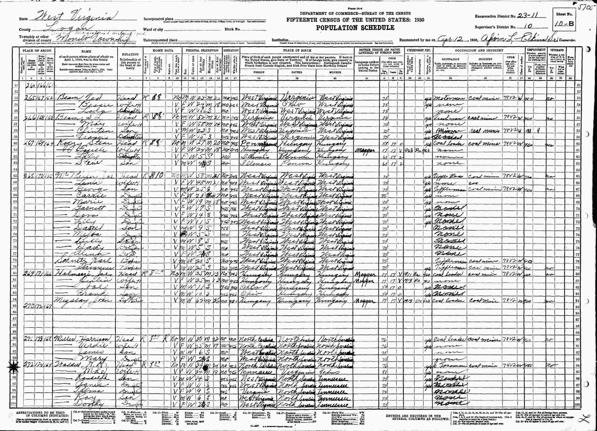 April 12, 1930 - Supervisor's District 10, Enumeration District 23-11, Logan Magisterial District, Monelo Township, Logan County, West Virginia.