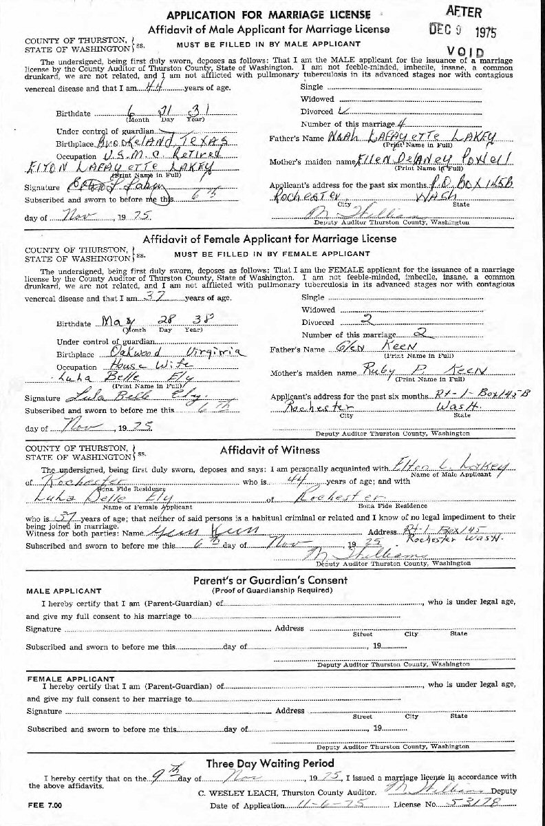 (2) Lula Bell Keen November 9-December 9, 1975 in Thurston County, Washington. (NOTE: Did they marry or just get marriage license? He not listed in social security application index.)