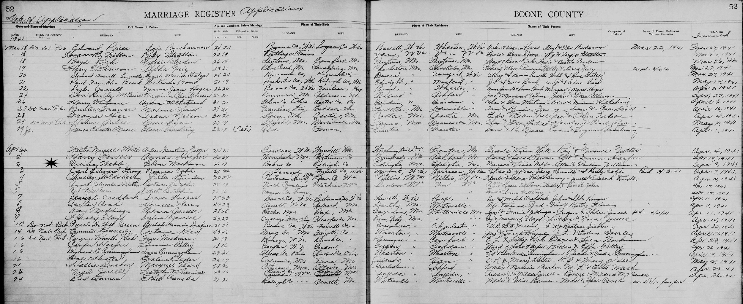 Married: John Quincy Webb April 3, 1941 in Boone County, West Virginia. (Marriage License; April 2, 1941.)