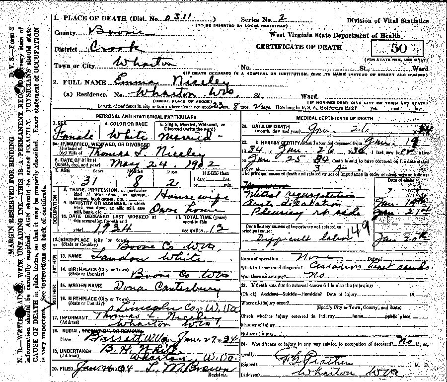 Died: January 26, 1934 in Wharton, Boone County, West Virginia.