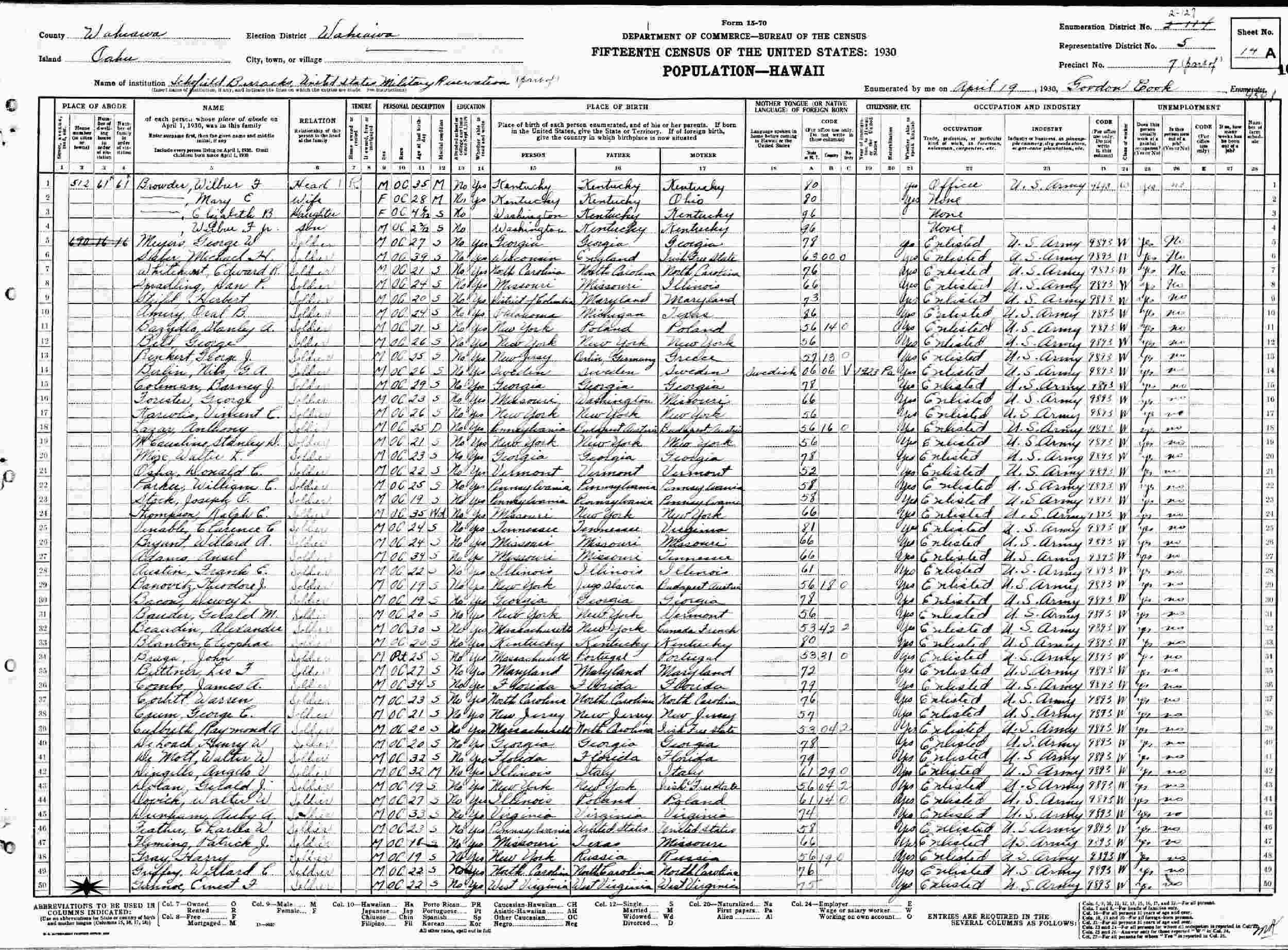 April 19, 1930 - Precinct 7, Representative District 5, Enumeration District 2-114 (crossed out to 2-127), Schofield Barracks, Wahaiwa, Wahaiwa County, Oahu (now Hawaii).