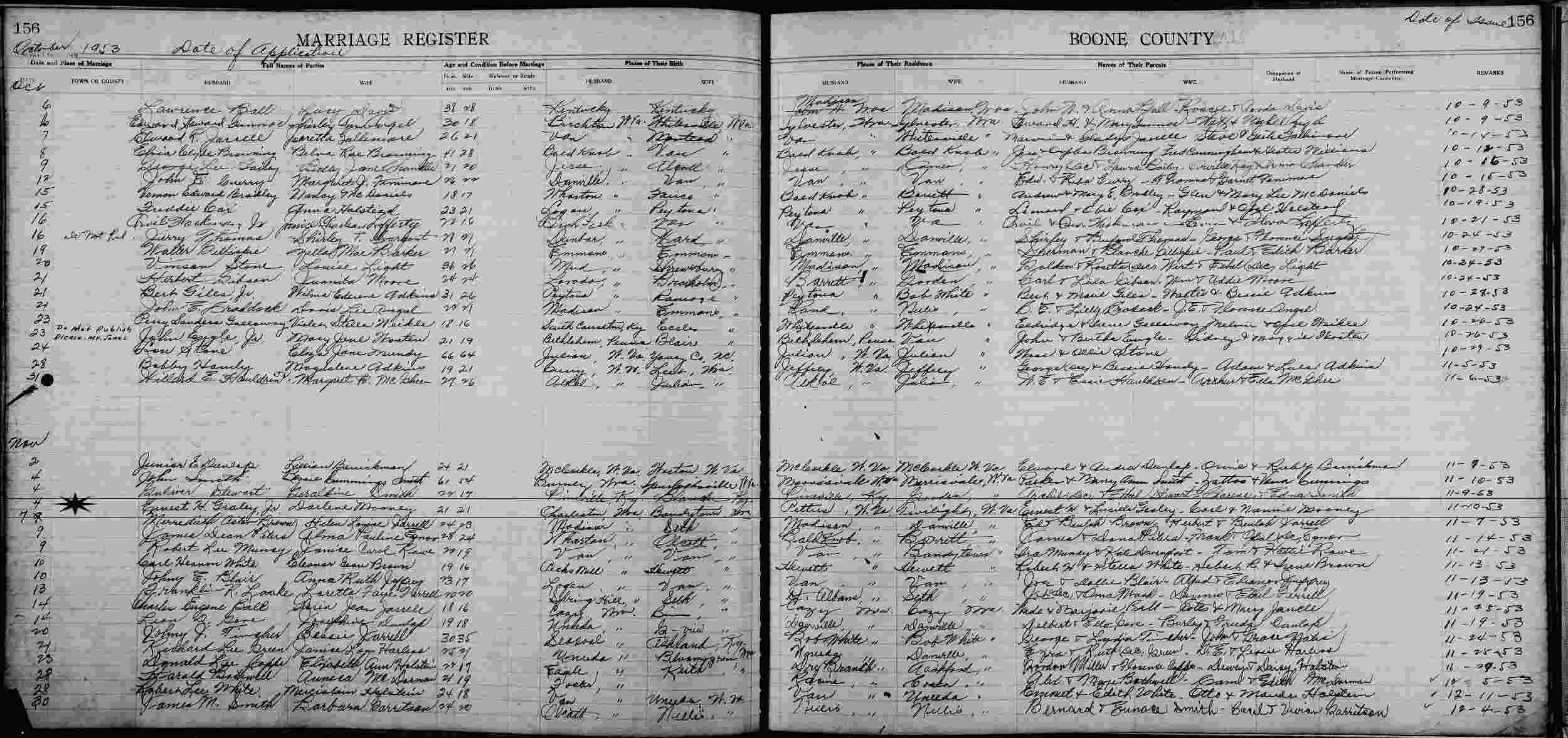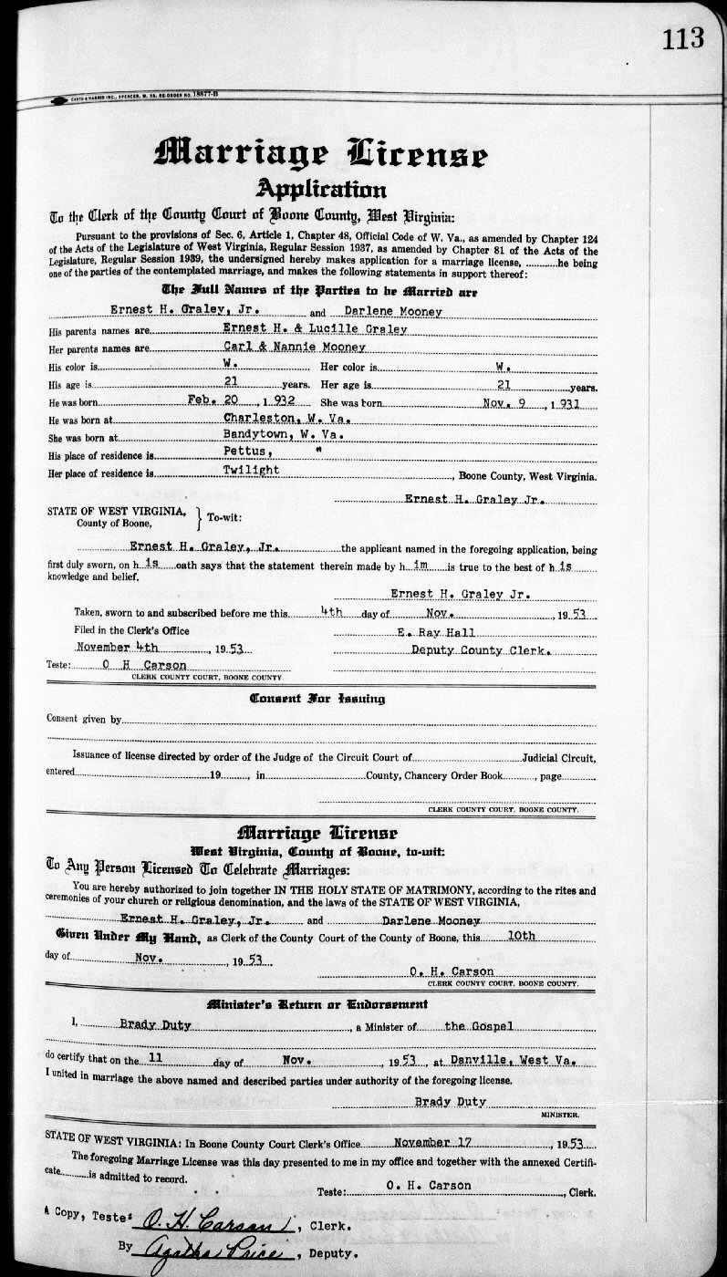 Married: Darlene Mooney November 11, 1953 in Danville, Boone County, West Virginia. (Marriage License: November 4, 1953.)